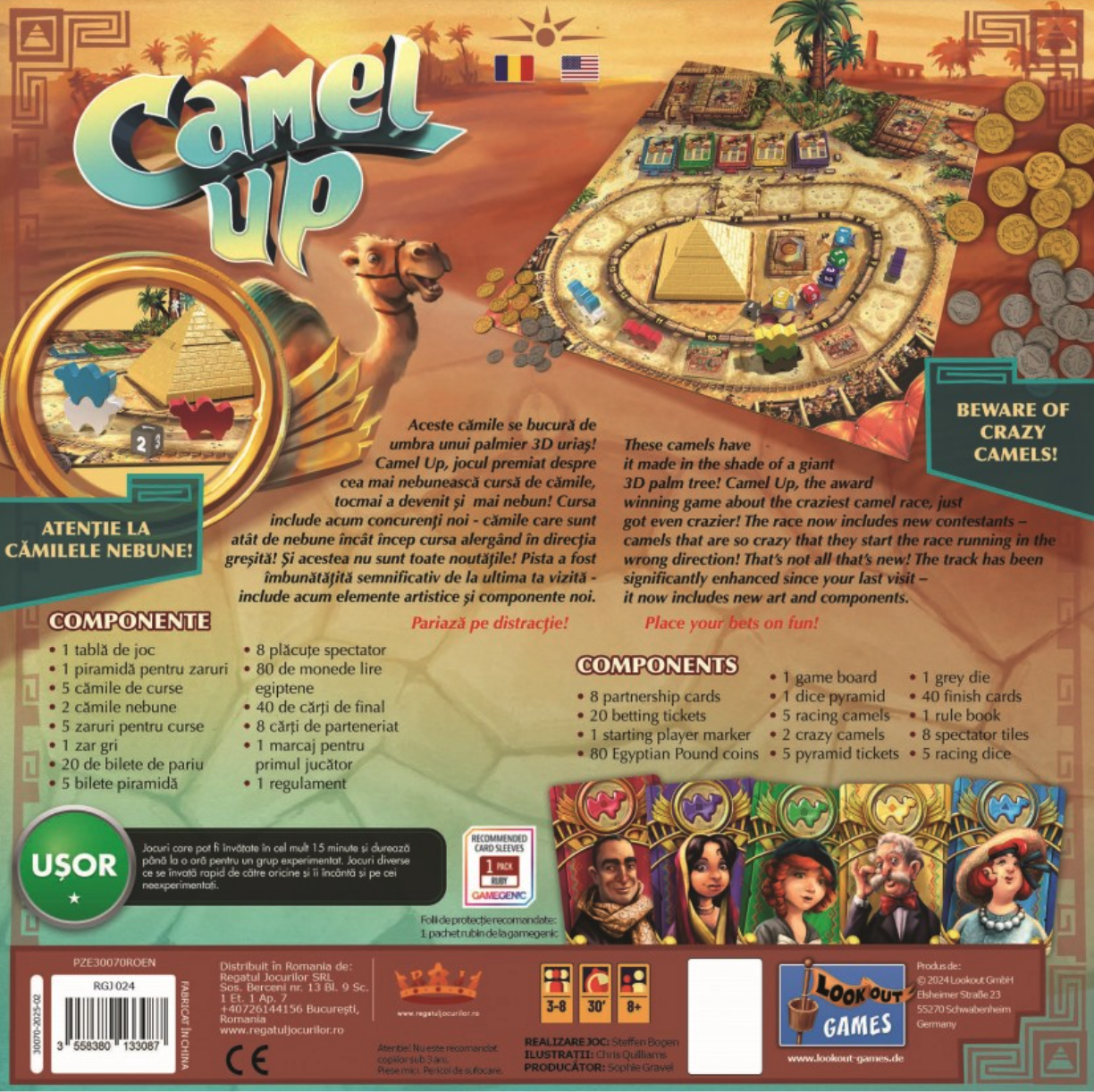 This 2025 edition of Camel Up features new artwork, a new game board design, a new pyramid design, engraved dice, and new game modes, including crazy rogue camels that start the race running in the opposite direction! You never know how a race will end!