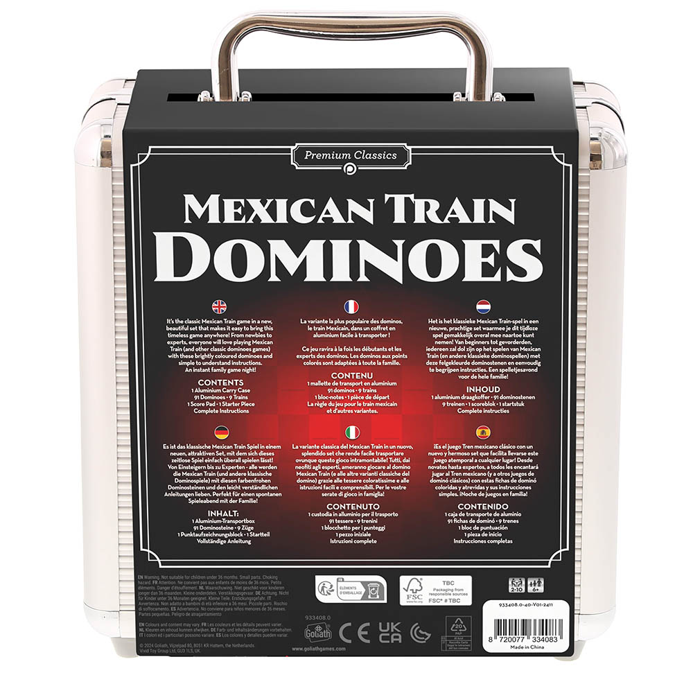 Setul contine o cutie de transport din aluminiu, 91 piese domino, 9 trenulete, 1 carnet pentru scor, 1 piesa de start si instructiuni complete.