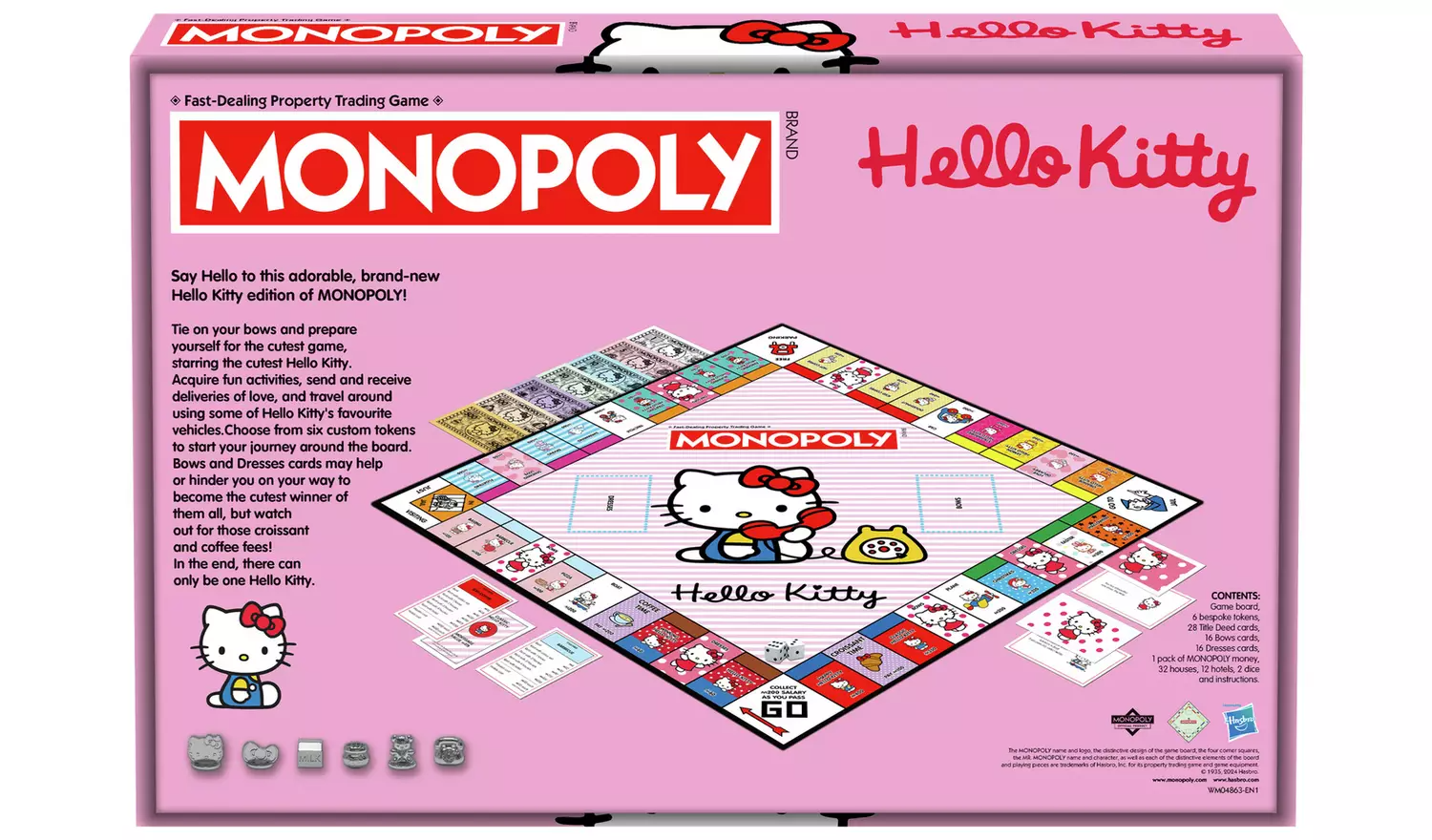 Buy up colour sets and use your Hello Kitty themed Monopoly money to expand your empire by building houses and hotels.