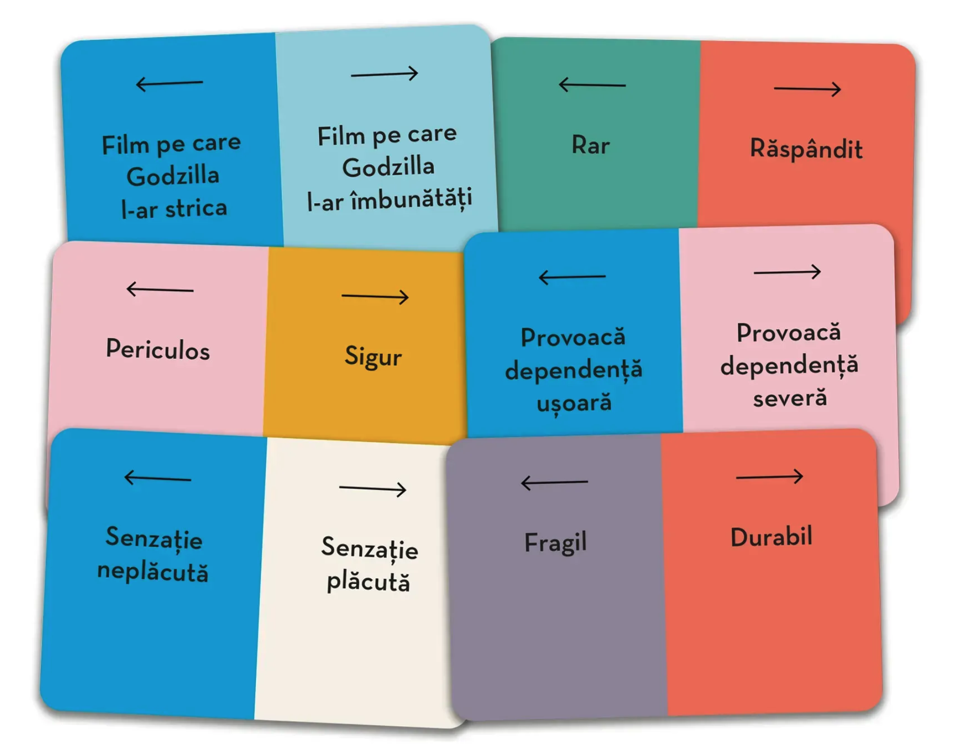 - Teme amuzante și uneori profunde: de la „Rece – Fierbinte” până la „Acceptabil – Inacceptabil”