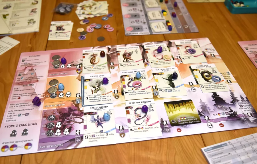 În timpul unui joc de Wyrmspan, vei construi un sanctuar pentru dragoni de toate formele și dimensiunile. Sanctuarul tău începe cu 3 spații excavate - spațiul cel mai din stânga din Peștera ta Crimson, Grota ta de Aur și Abisul tău de ametist.
