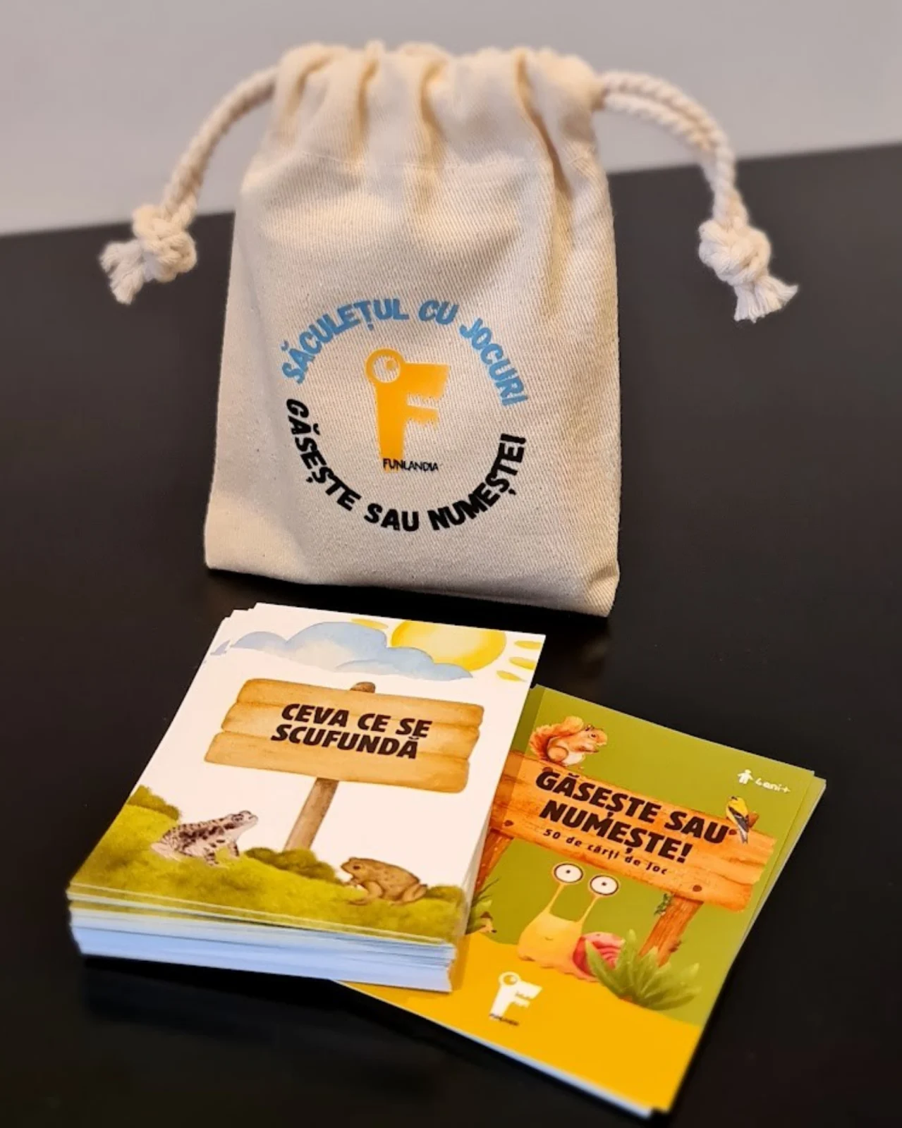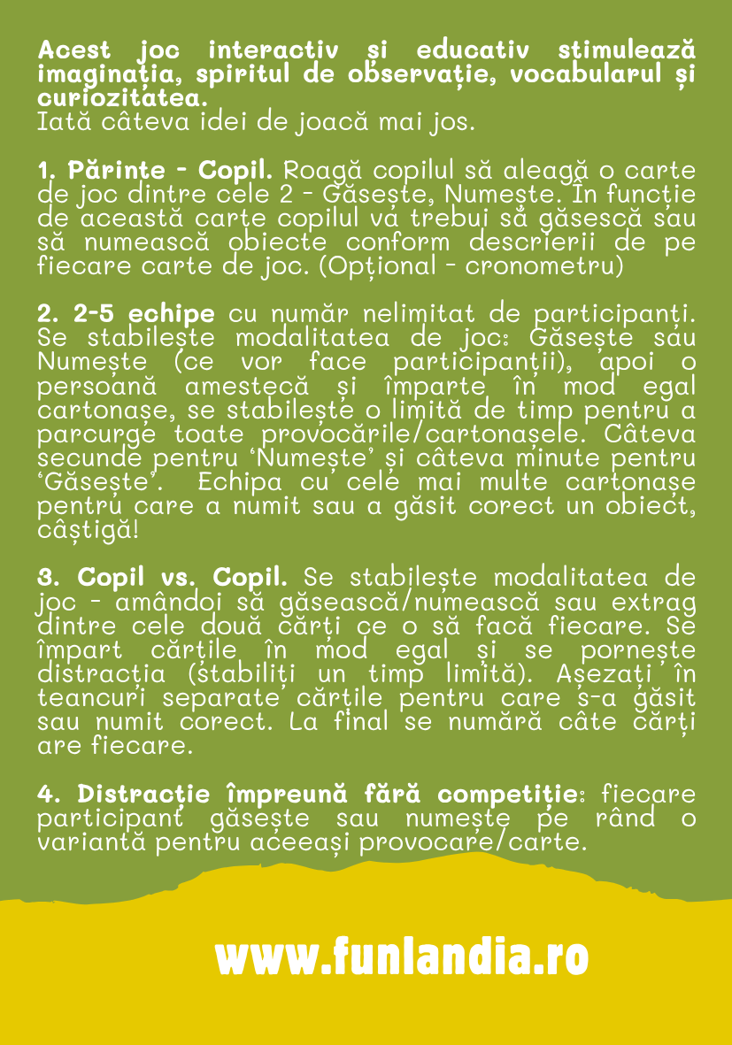 Fiecare cartonaș îți aduce o provocare: trebuie să găsești sau să numești un obiect specific pe baza unei descrieri simple.
