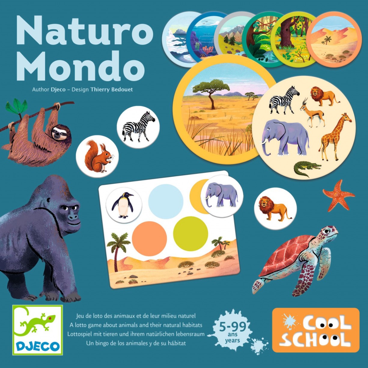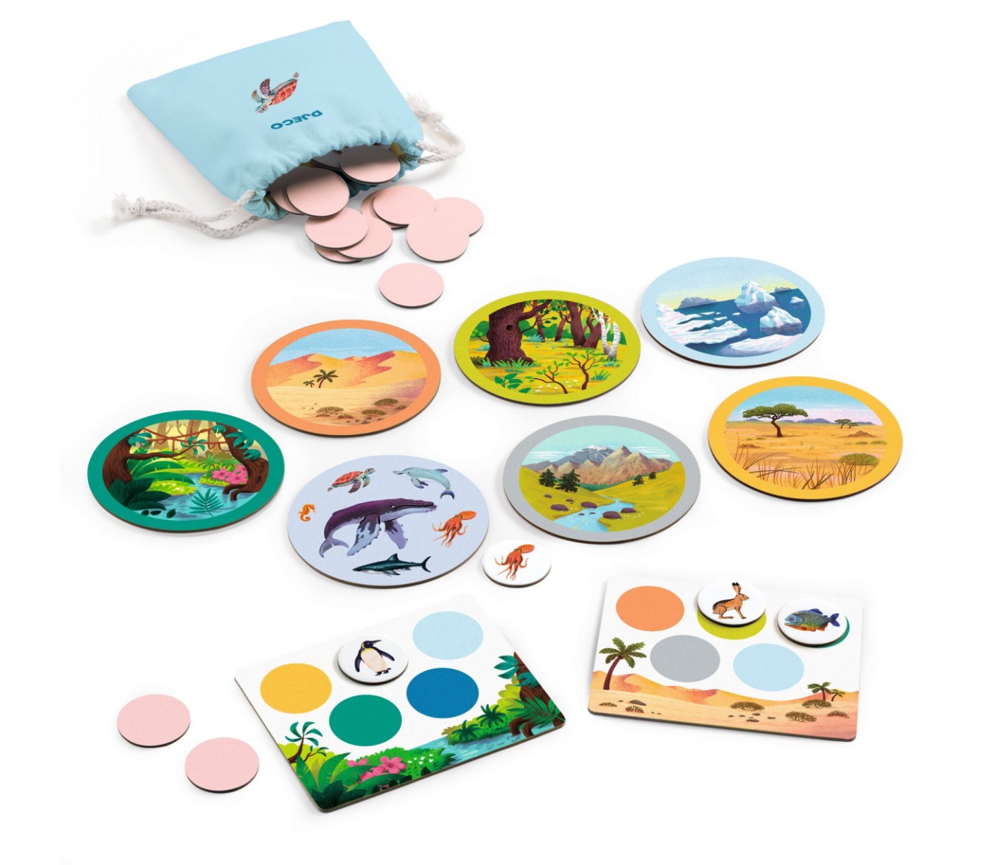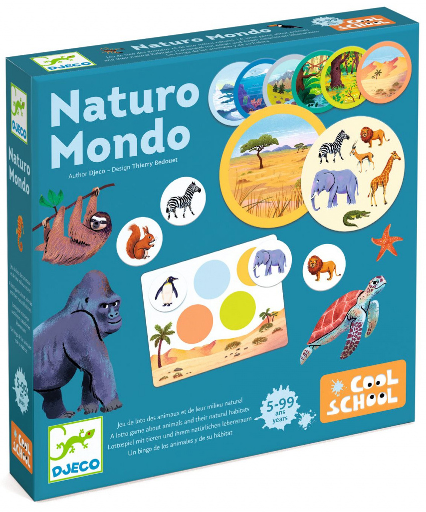 Continut: 6 planse de bingo, 7 carti cu mediu natural, 49 jetoane cu animale, saculet textil.