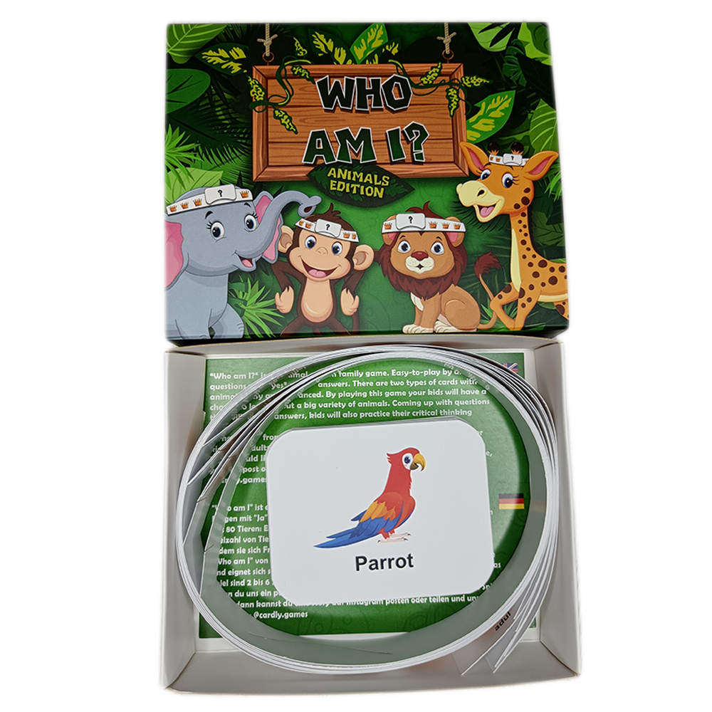 "Who am I" editia cu animale, este un joc de familie. Usor de jucat,prin intrebari care se raspund cu "da" sau "nu". Jocul contine carduri cu 80 de animale clasificate pe nivele: Simplu si Avansat. Prin acest joc, copii vor putea invata despre o varietate mare de animale. Prin a pune intrebari despre caracteristici/trasaturi pentru a ghici animalul de pe card, copii vor practica abilitatile critice. "Who am I" de la Cardly Games este un joc clasic de intrebari pentru copii si adulti. Pentru acest joc, este nevoie de 2-6 persoane.