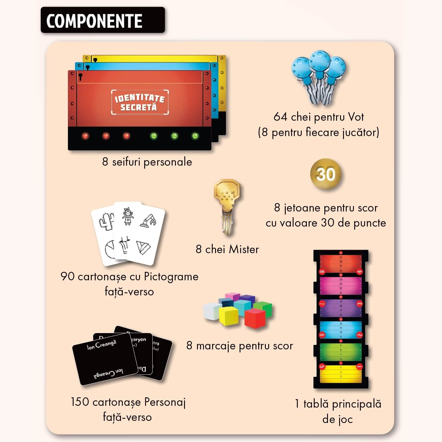8 seifuri personale, 64 chei pentru Vot (8 pentru fiecare jucator), 8 chei Mister, 1 tabla principala de joc, 90 cartonase cu Pictograme fata-verso, 150 cartonase Personaj fata-verso, 8 marcaje pentru scor, 8 jetoane pentru scor, instructiuni de joc in limba romana.