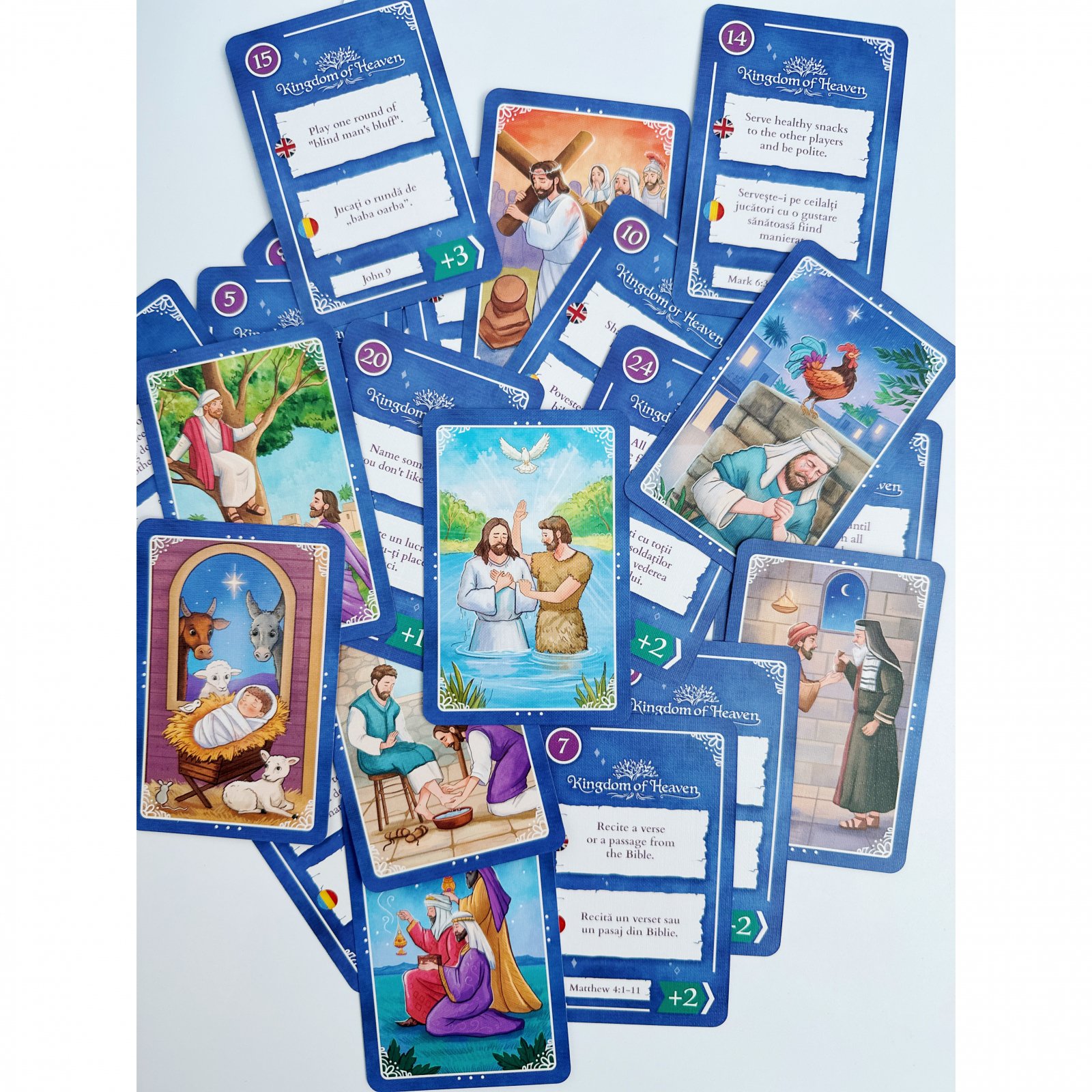 - 25 carduri cu ilustrații specifice episoadelor cheie din viata lui Iisus, cu câte o referință biblică și cu câte o provocare (în limba engleză și în limba română) - ambalate în folie biodegradabilă.