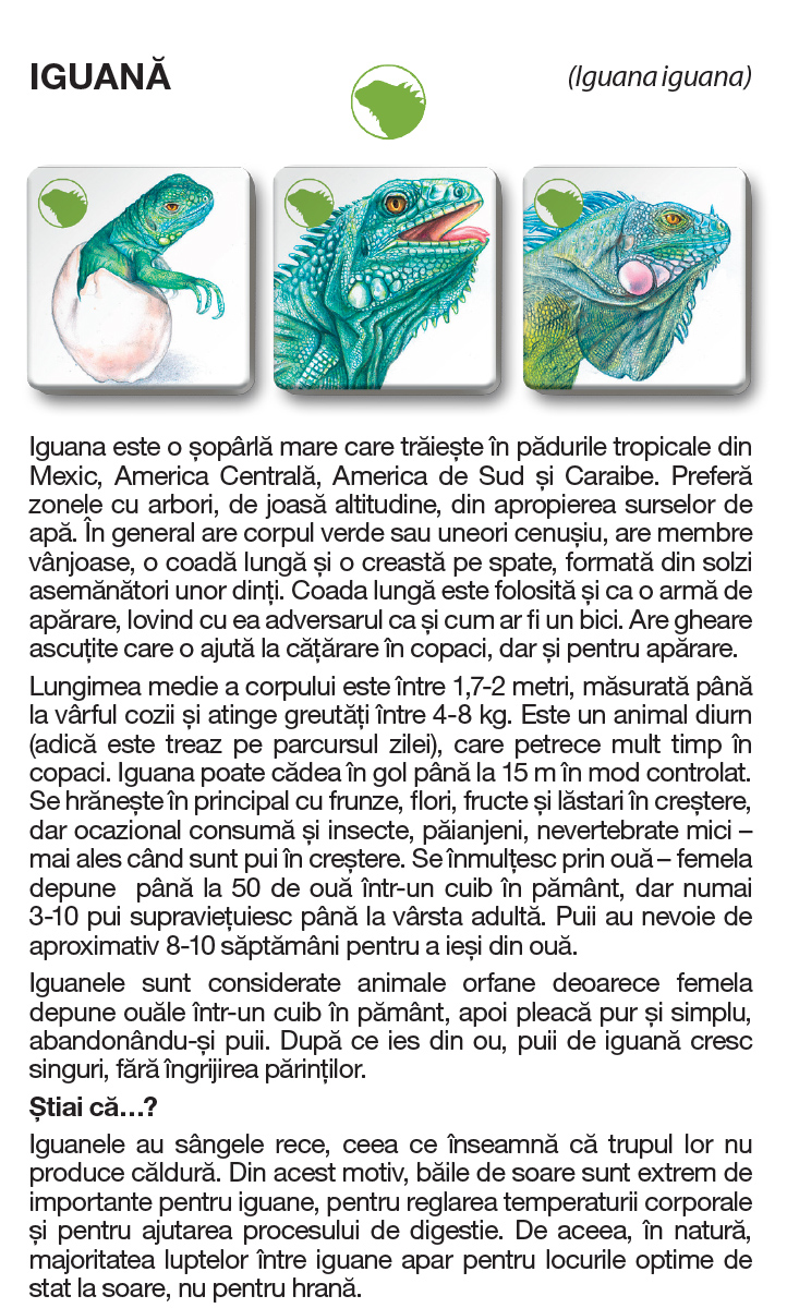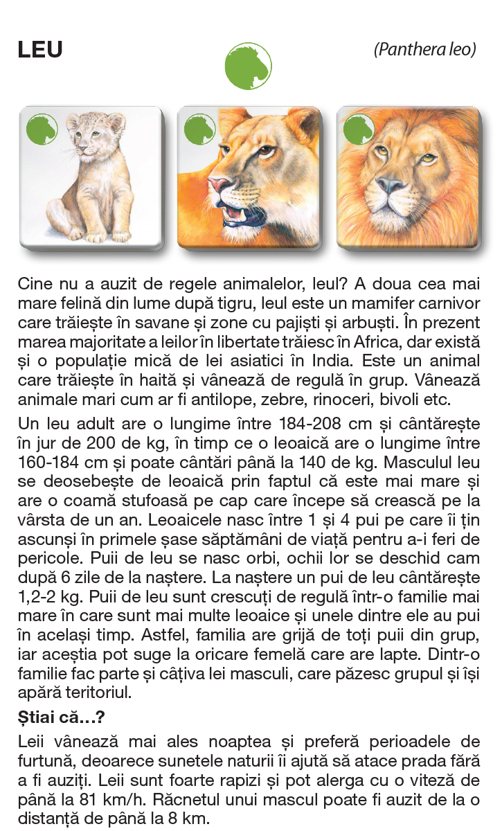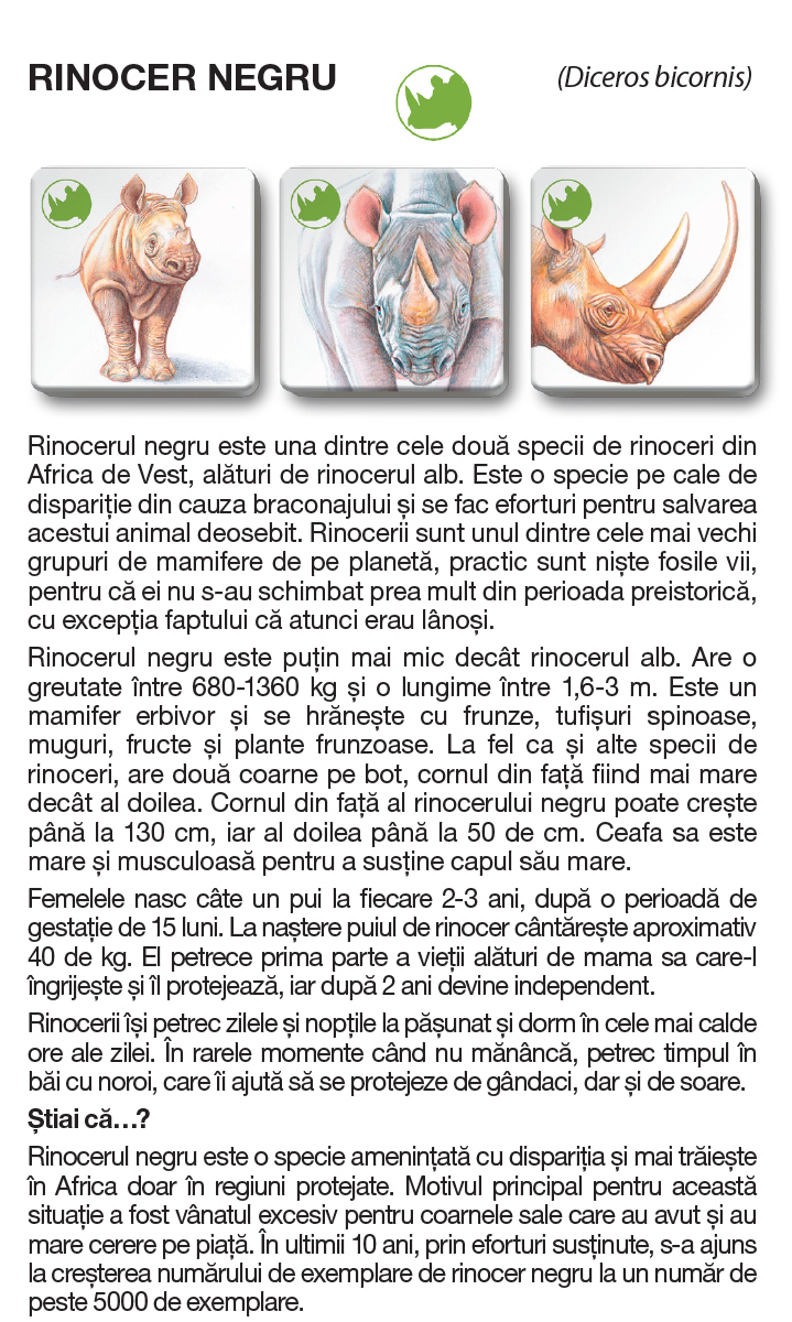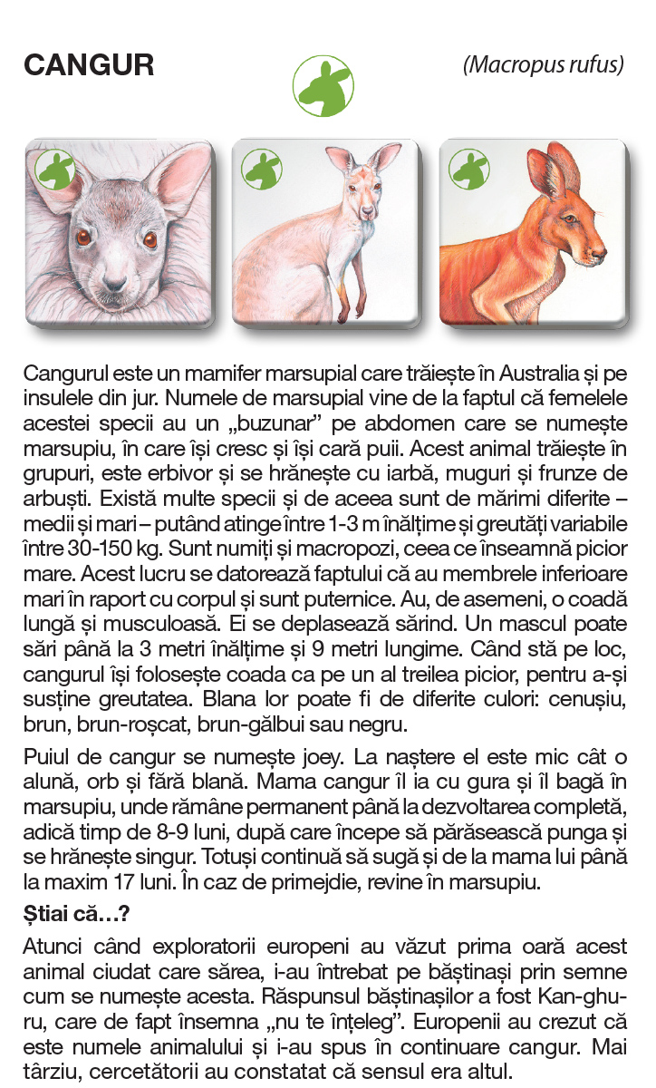 - 1 minienciclopedie de 16 pagini color cu instructiunile de joc si prezentarea a 12 animale (text si ilustratii).