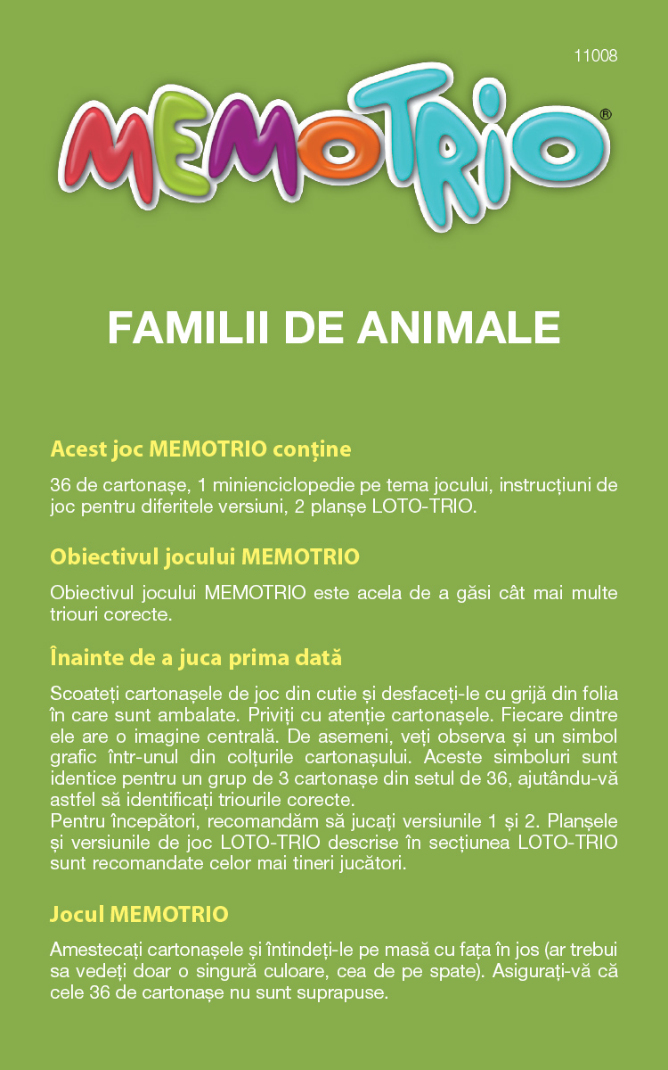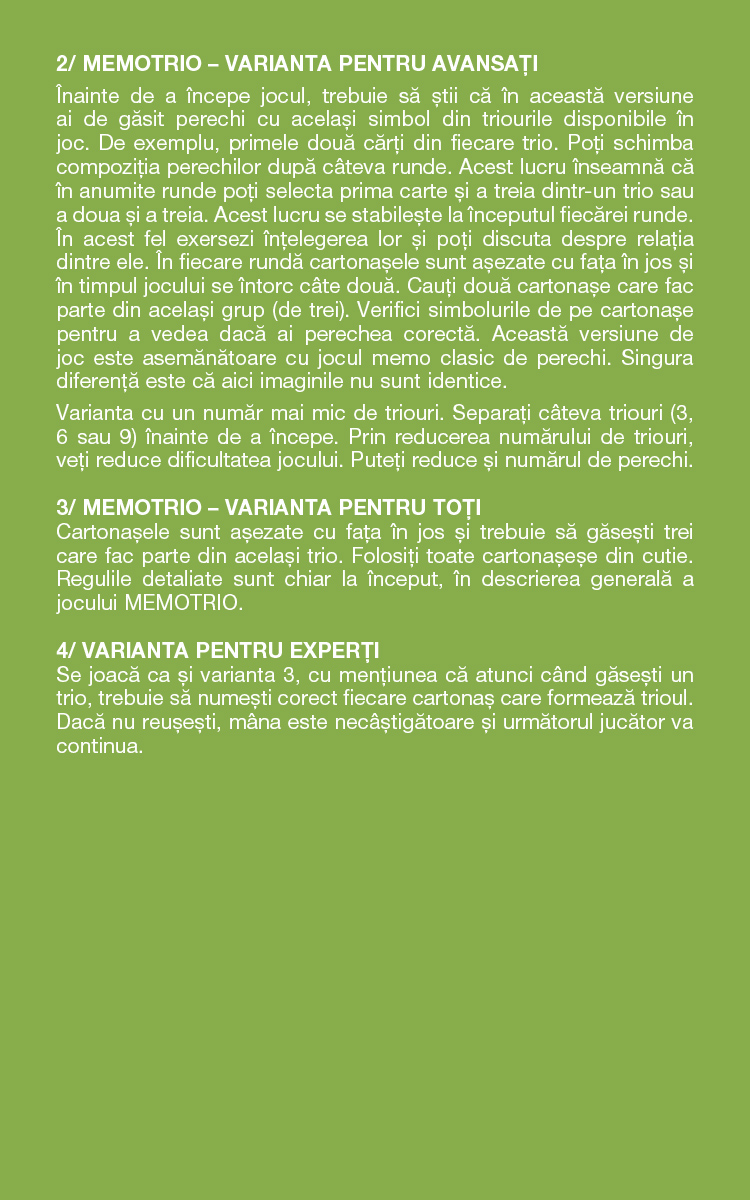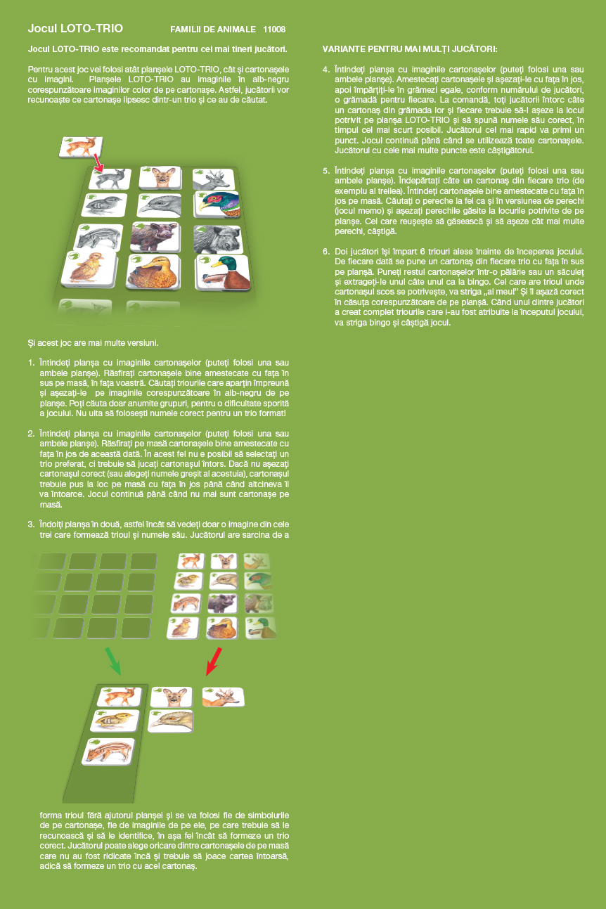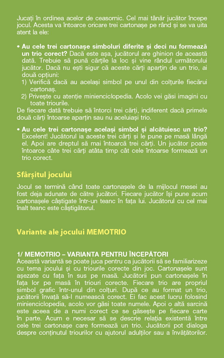 - 36 de cartonase rezistente cu imagini pe care copilul le poate potrivi in 12 triouri tematice in jocul memotrio.