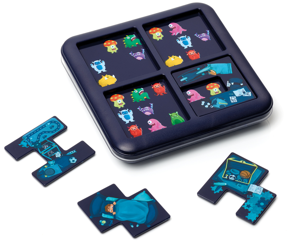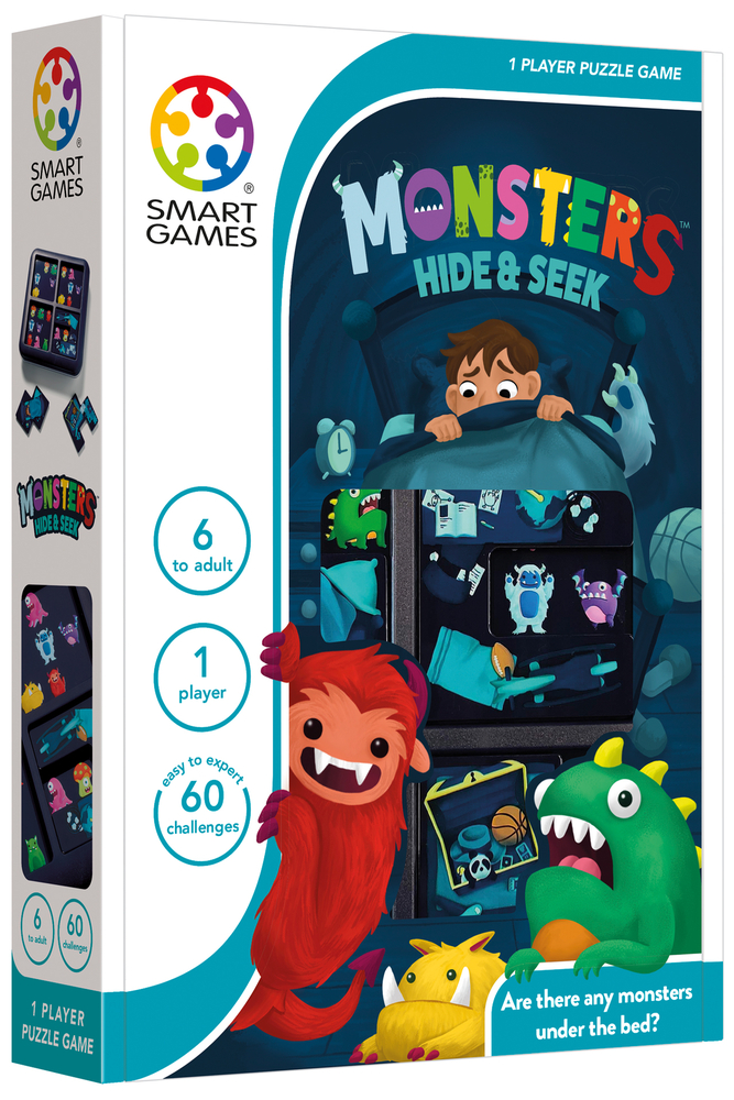 Noaptea, din patul tau, se aud brusc zgomote ciudate? Cine sunt acei monstruleti care te viziteaza? Pentru a afla, aseaza cele 4 piese pe tabla de joc in asa fel incat sa ramana vizibili doar monstruletii invitati. Monsters hide & seek contine 60 de provocari de la usor la dificil.