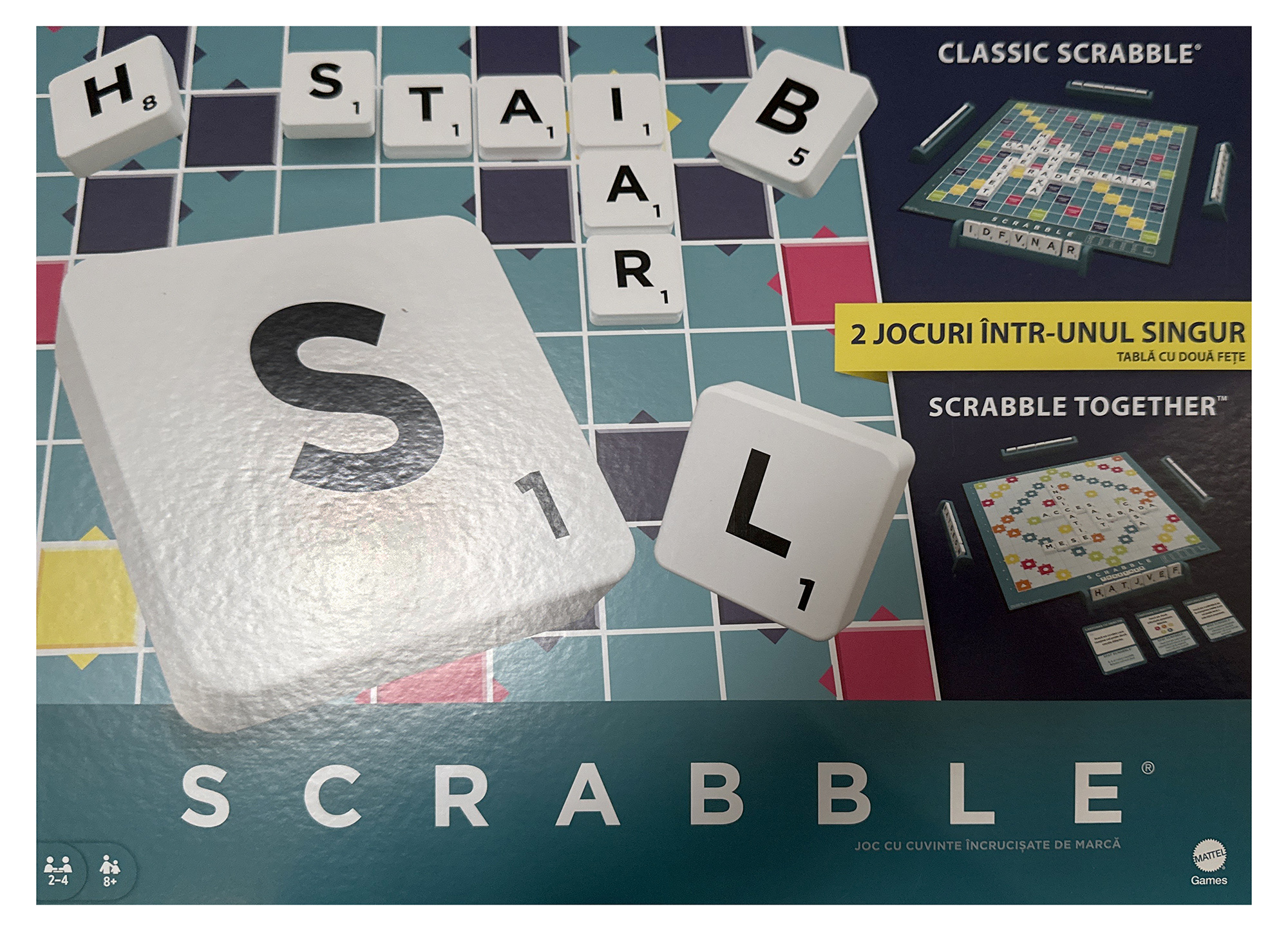 Cu noul joc de masa Scrabble, experimentati distractia dincolo de cuvinte in doua moduri captivante! Acest joc, potrivit pentru 2-4 jucatori, aduce o abordare inovatoare in universul Scrabble, incluzand 50 de carti de obiectiv pentru a invata notiunile de baza ale jocului. Construiti cuvinte pe tabla de joc incrucisat, obtinand scoruri duble si triple pentru litere si cuvinte. Experimentati traditionalul joc de cuvinte incrucisate Scrabble, aducand un element de competitie si strategie in timpul partidelor. Intoarceti tabla si intrati intr-un mod de joc nou - Scrabble Together. Aici, jucatorii coopereaza pentru a finaliza provocari de cuvinte, adaugand o dimensiune sociala si ocazionala experientei de joc. Cele 50 de carti de obiectiv introduc jucatorii in notiunile de baza ale Scrabble, oferind o modalitate distractiva de invatare si imbunatatire a abilitatilor lor lingvistice. Descoperiti bucuria jocului de cuvinte in doua moduri diferite cu noul Scrabble Board Game - o experienta educativa si distractiva pentru toata familia!