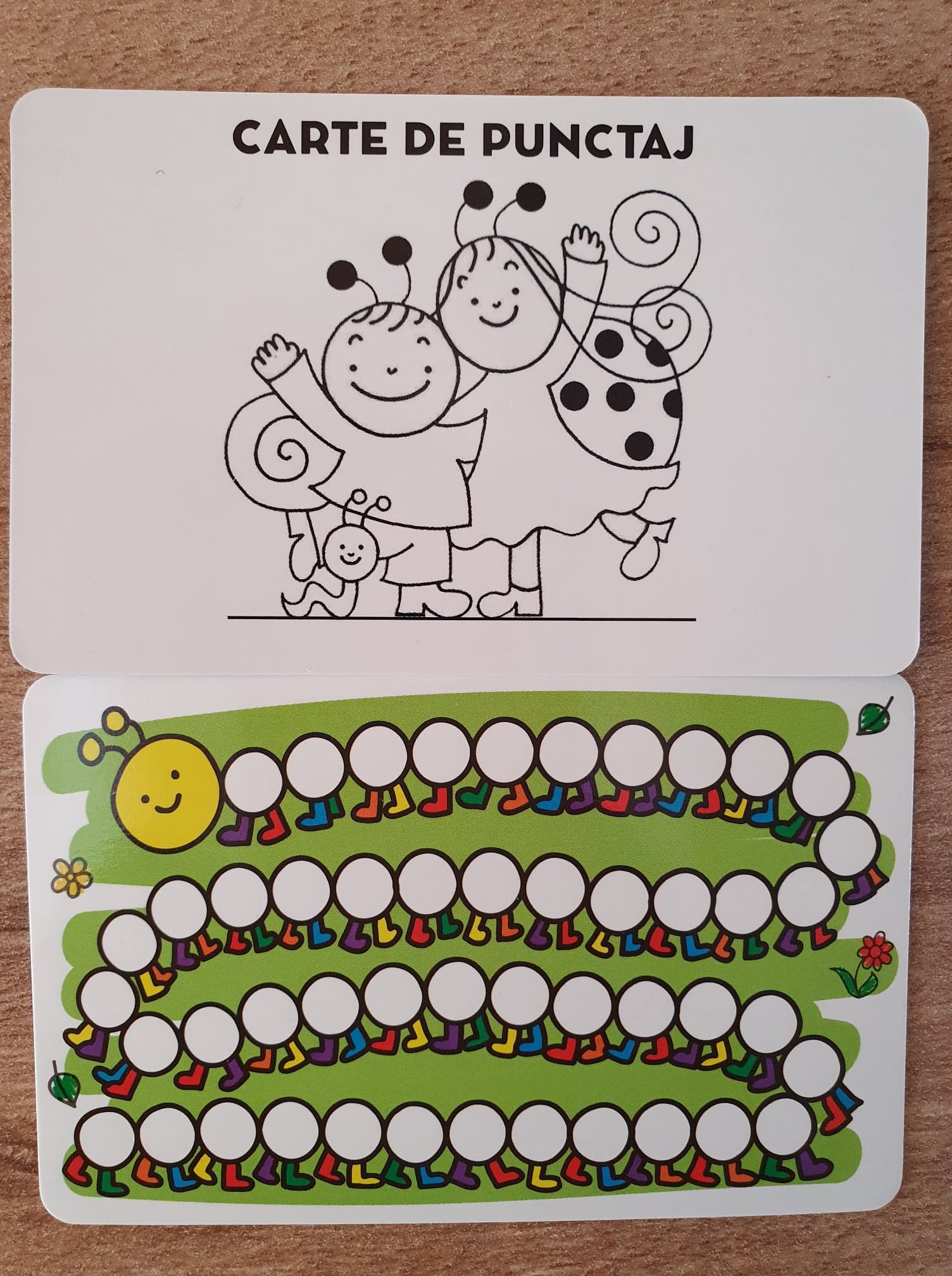 Contine: 55 de carti cu imagini cu Bobita si Buburuza, 5 carti de punctaj, 6 carioci cu buretei si regulament in limba romana.