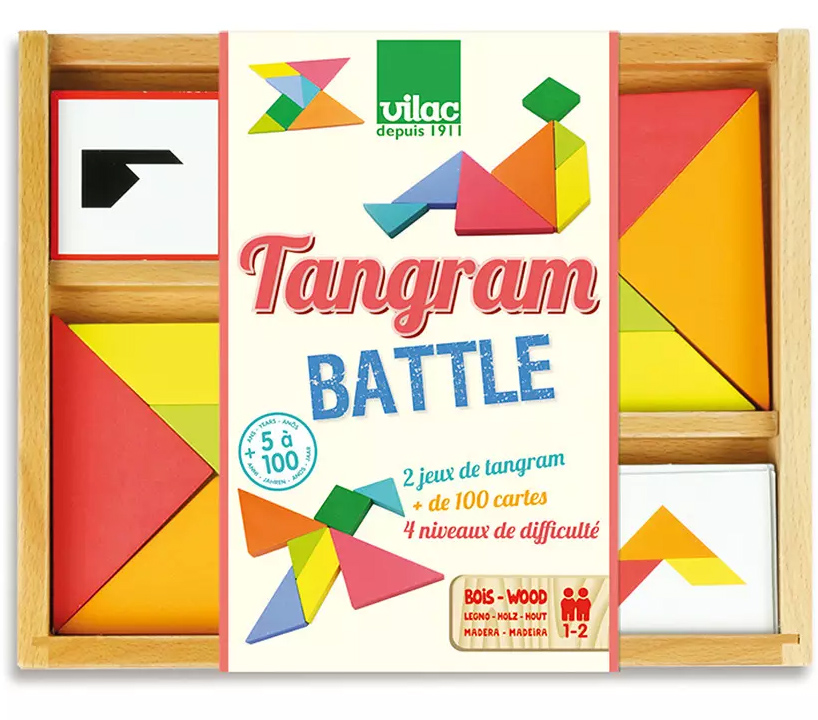 Jocul vine frumos prezentat într-o cutie din lemn. Include 100 de cărți și două jocuri separate de Tangram. Poți juca singur sau împotriva unui alt jucător.