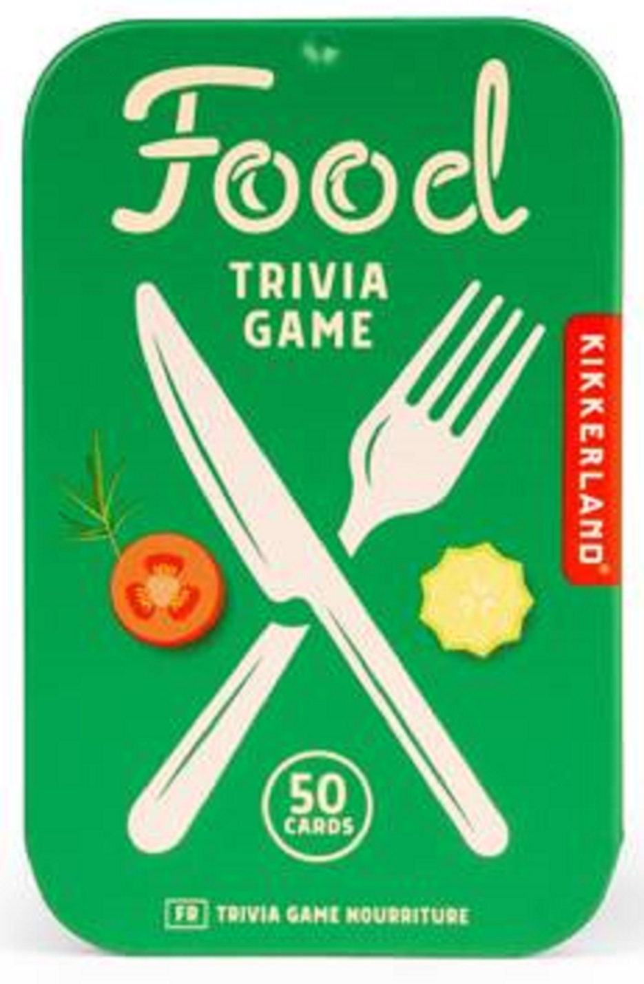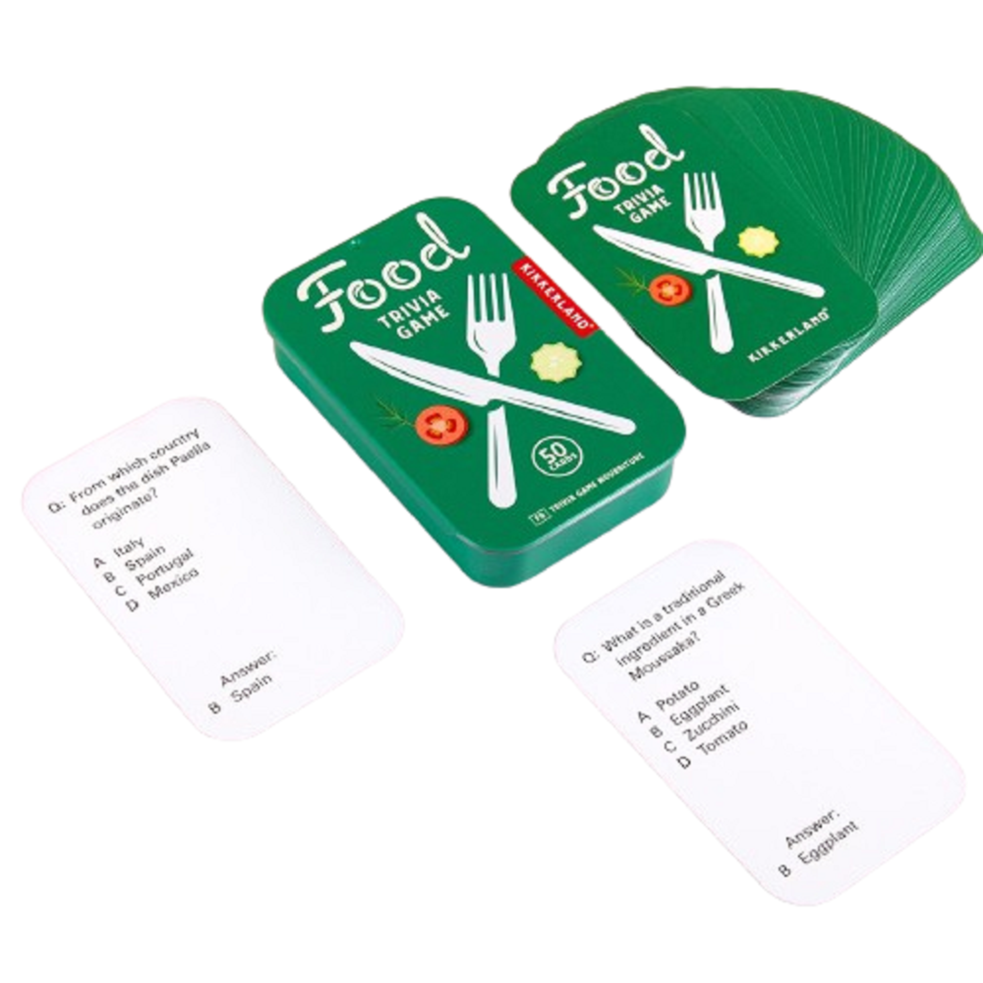 Jocul trivia - Mancare are 50 cartonașe cu întrebări despre mâncare și răspunsuri multiple.