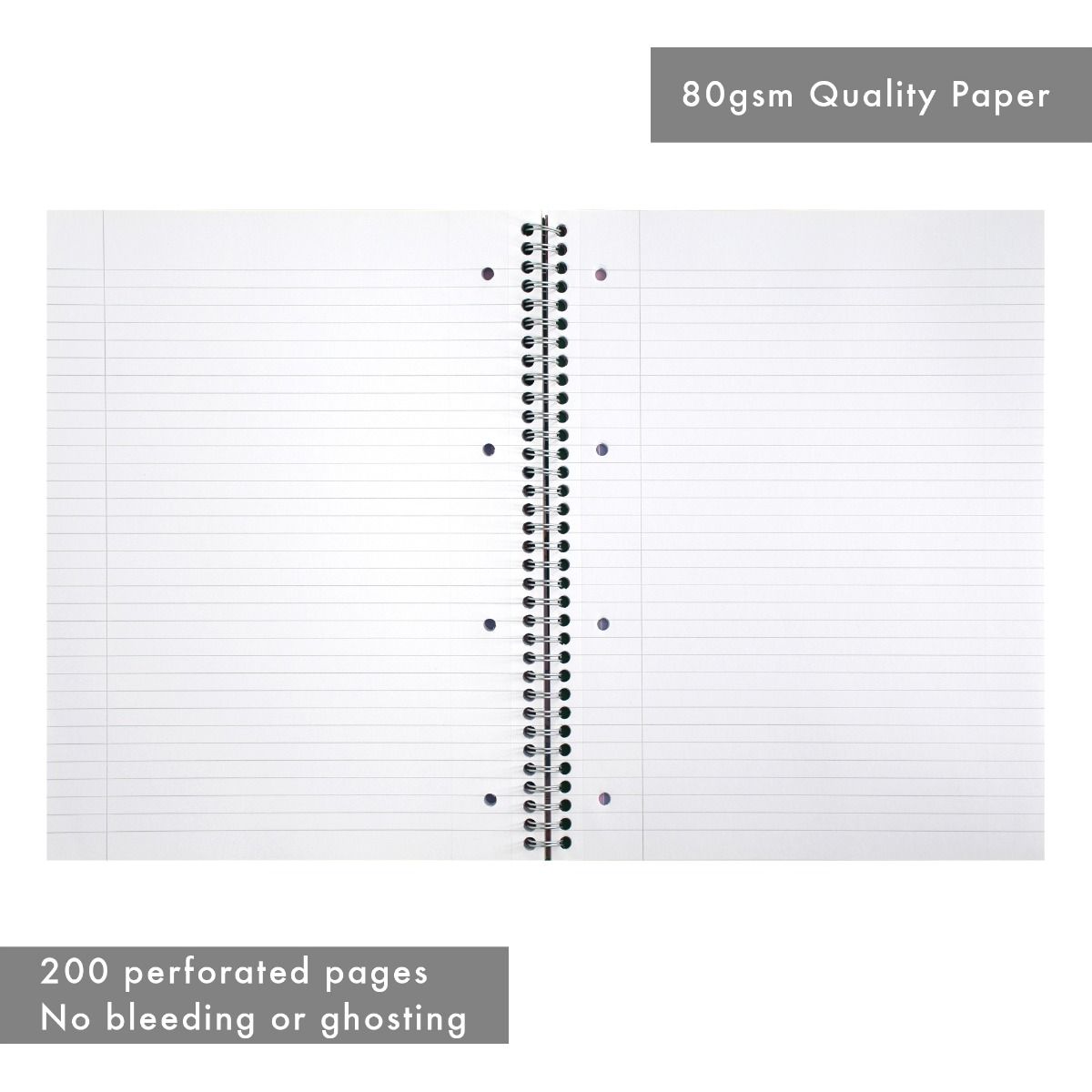Notează notițe și mementouri în acest caiet Pukka A4 cu pagini late, cu linii. Fiecare pagină este perforată, astfel încât paginile se pot rupe la dimensiunea A4 pentru o arhivare ușoară.