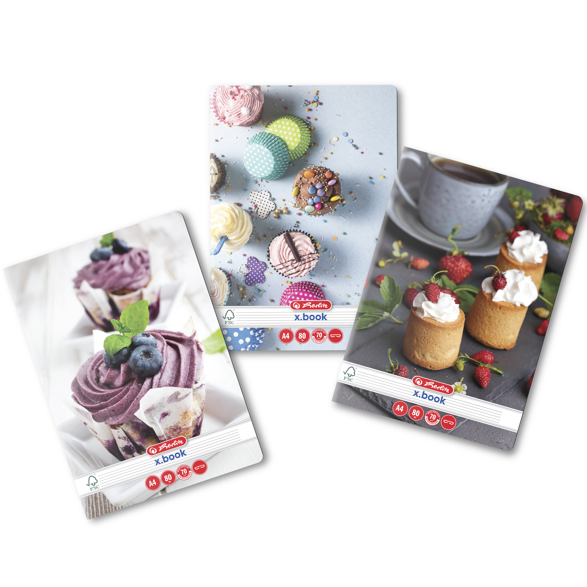 Caiet, format A4, coperti din carton dublu cretat lucios, colturi rotunjite, hartie 70 g/mp, 80 file, dictando, capsat, motiv Cupcakes.