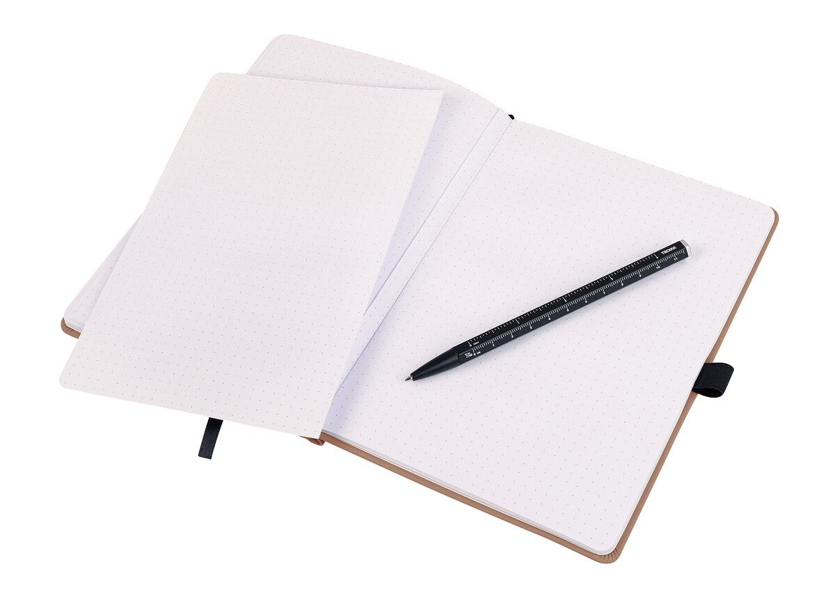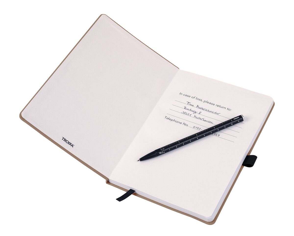 Carnetul include un pix multifuncțional cu riglă din colecția Troika Construction.