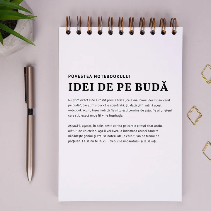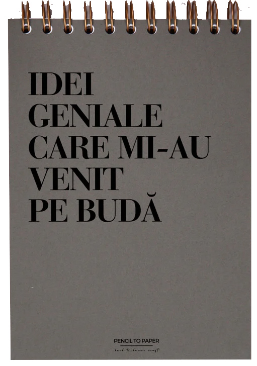 Cel mai amuzant cadou pentru prietenii tai a fost creat plecand de la citatul „Cele mai bune idei mi-au venit pe buda”. Nu stim exact cui ii apartine, dar ni s-a intamplat si noua si stim sigur ca ti s-a intamplat si tie. Notebook-ul "Idei geniale care mi-au venit pe buda" este numai bun de pus peste cartea pe care o citesti doar acolo. In paginile lui poti nota rapid ideile imparatesti de pe tronul de portelan, ca sa nu te iei cu... treburile imparatului si sa le uiti. Fa-l cadou colegului, prietenului sau iubitului de ziua lui sau de Craciun, ca sa stie ca te-ai prins de unde-i vin toate ideile geniale.