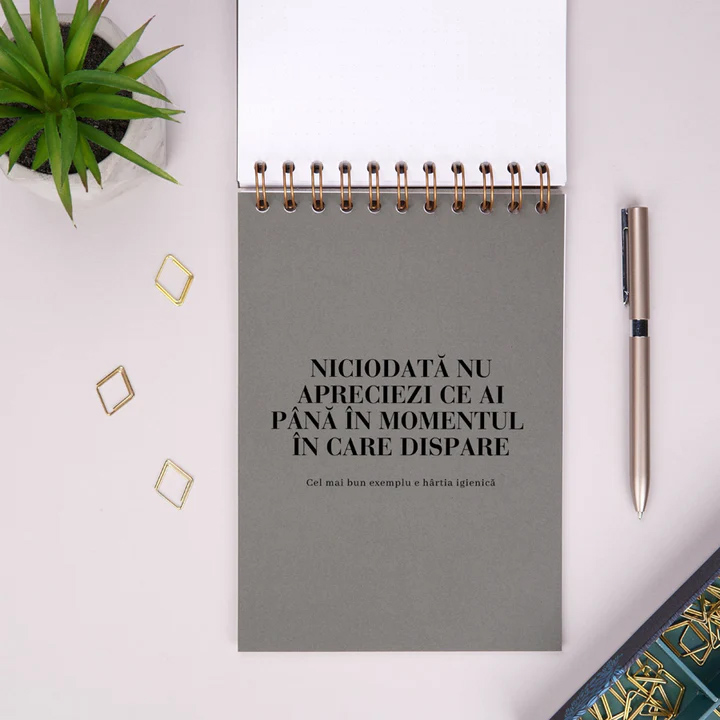 Notebook-ul are coperta spate din carton rigid, ca sa poti scrie pe el oriunde te-ai afla. La interior, are 80 de file imprimate cu puncte pentru scriere si trei despartitoare din acelasi carton premium ca si coperta fata. Fiecare despartitor este imprimat cu citate amuzante. Notebook-ul este legat cu spirala aramie din metal. Prima pagina a notebook-ului se poate personaliza cu o fotografie si un nume.
