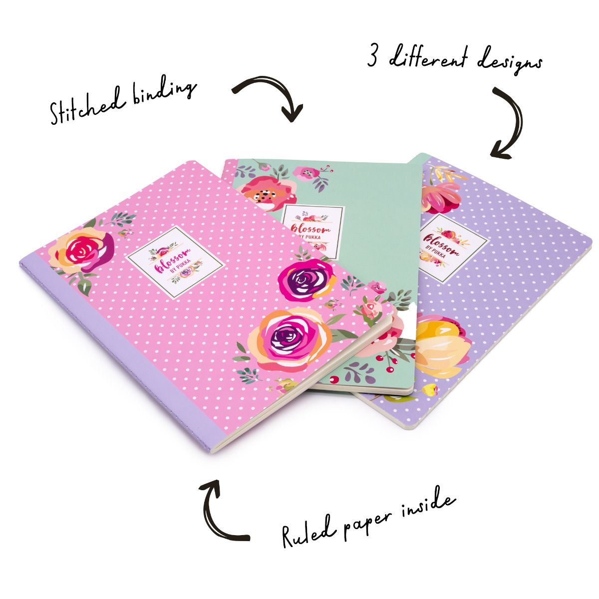 Set 3 caiete Pukka Pad Bloosom dictando, A5, 140/pag/caiet, 80g, roz, verde, mov.
