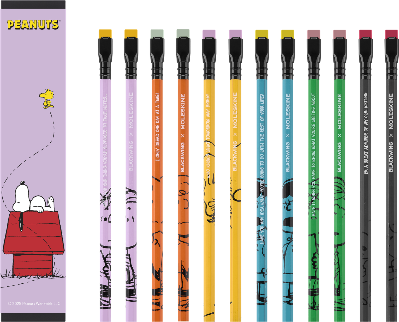 Capture thoughts, ideas, and doodles with this Peanuts x Moleskine Notebook and Pencil set —a celebration of simple truths and the power of handwriting. The gift box features a large, ruled notebook with iconic Peanuts graphics that highlight the joy of writing, along with 12 limited edition Peanuts pencils by Blackwing.