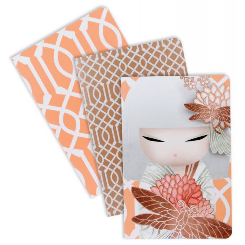 Setul de 3 carnetele Kimmidoll Kazumi este un articol de papetarie stilat care iese din anonimat prin design si calitate. Carnetelele Kazumi Kimmidoll sunt ambalate intr-o folie transparenta, au copertile din carton si paginile liniate fin.
