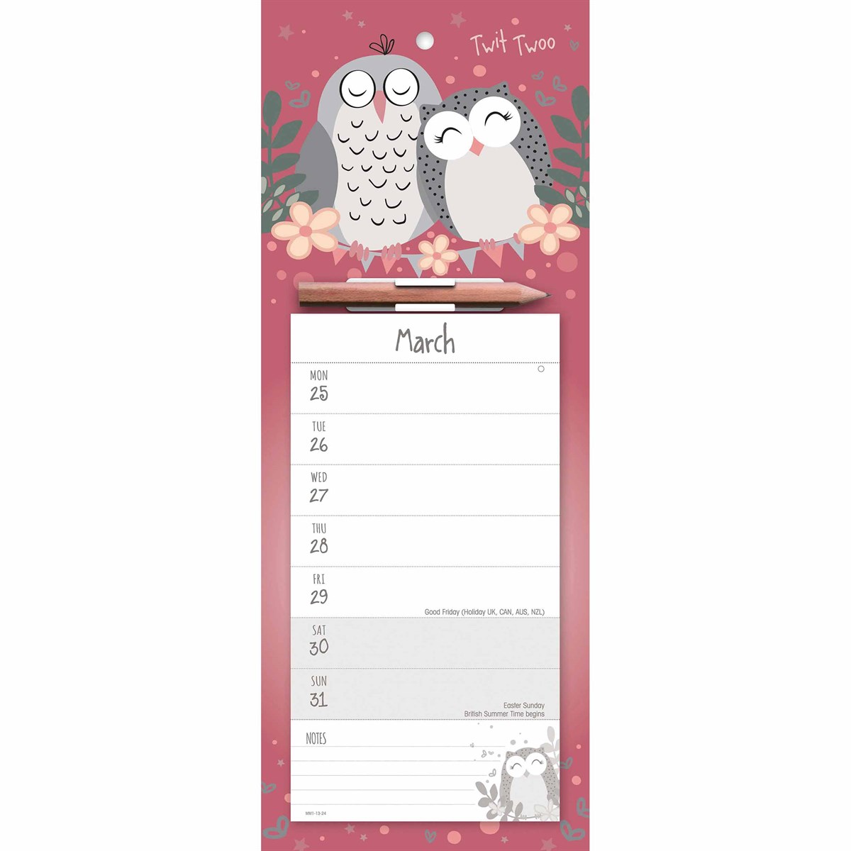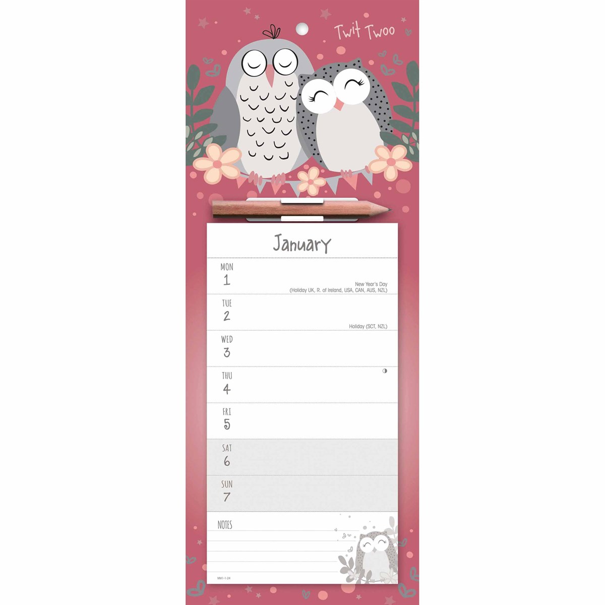 Calendarul Twit Twoo pentru 2024 are un magnet pe spate pentru a fi lipit de frigider, fiind potrivit și pentru agățat. Are câte o săptămână pe pagină și este completat de un creion pentru notițe.