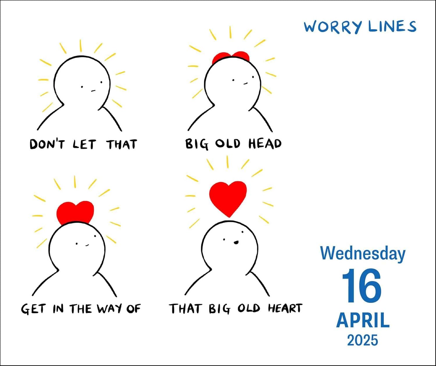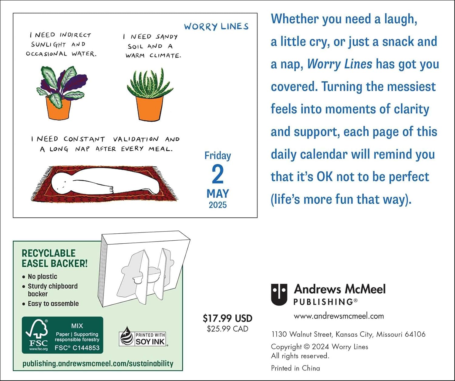 The wry witticisms and colorful blob drawings found in this Worry Lines 2025 Calendar can cheer up even the most jaded and burned-out soul. These quick, relatable comics are like a comforting and funny pat on the back from a trusted friend. Worry Lines has an extraordinary talent for turning the messiest feels into moments of clarity, support, and inspiration. Each page of this daily desk calendar will help reassure you to go easy on yourself and remind you that it’s OK not to be perfect.