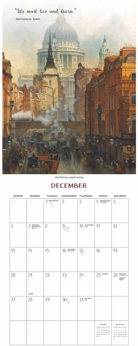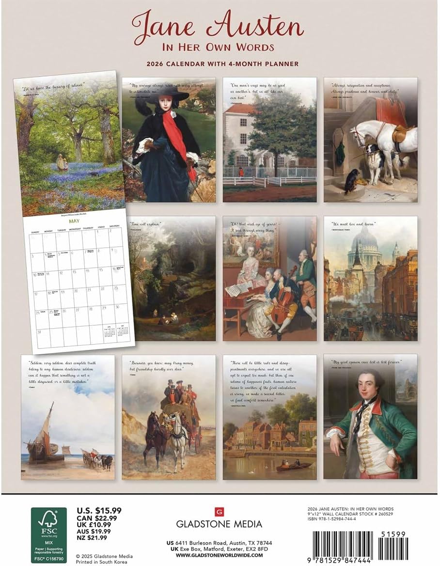 This deluxe wall calendar for 2026 is much like Jane Austen herself: sensible and appealing. Painted vistas of the English countryside, accompanied by quotations from Austen's work, evoke the spirit of her life and times. Yet, powerfully, it's Austen's unique pragmatism scored with romance and rhythm that still remains relevant two centuries later.