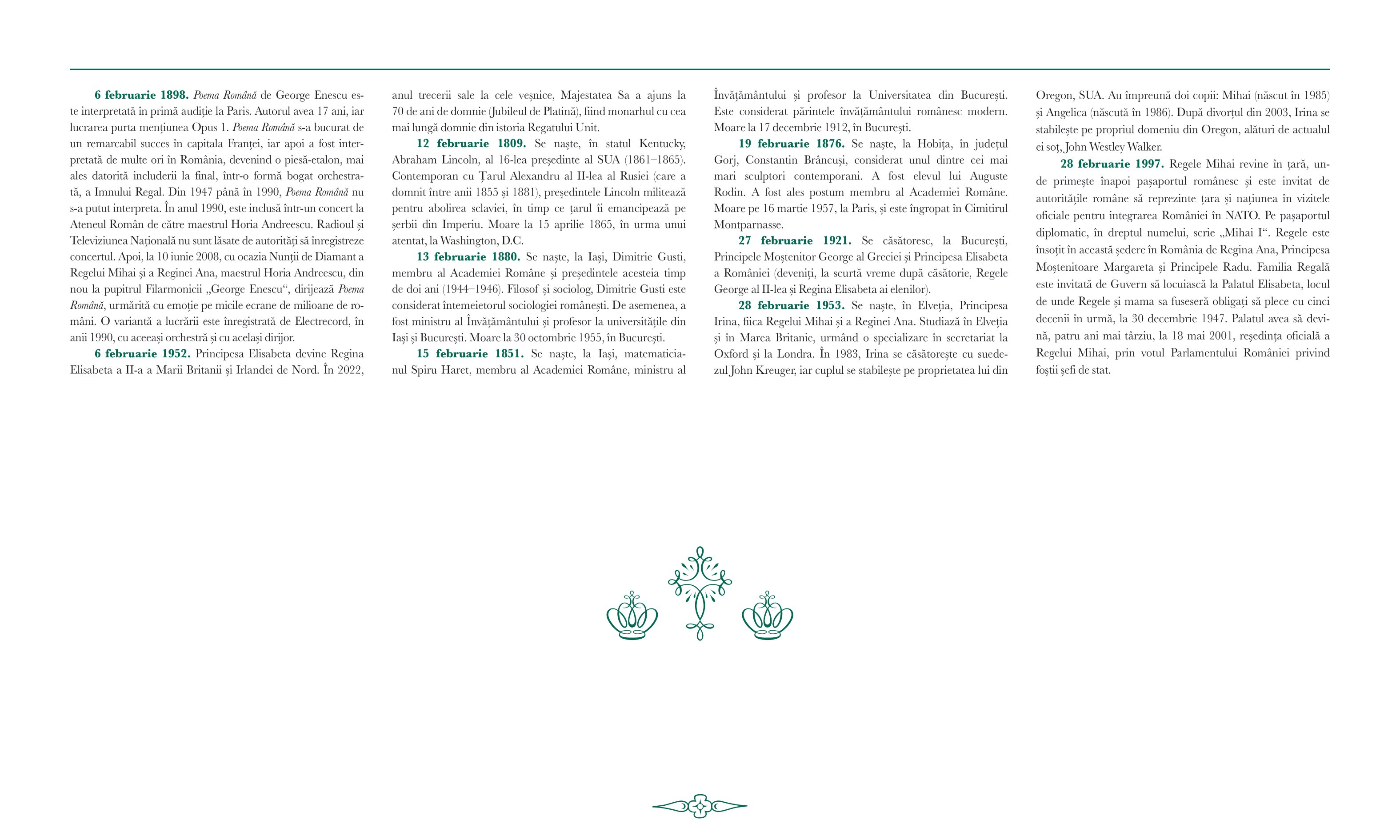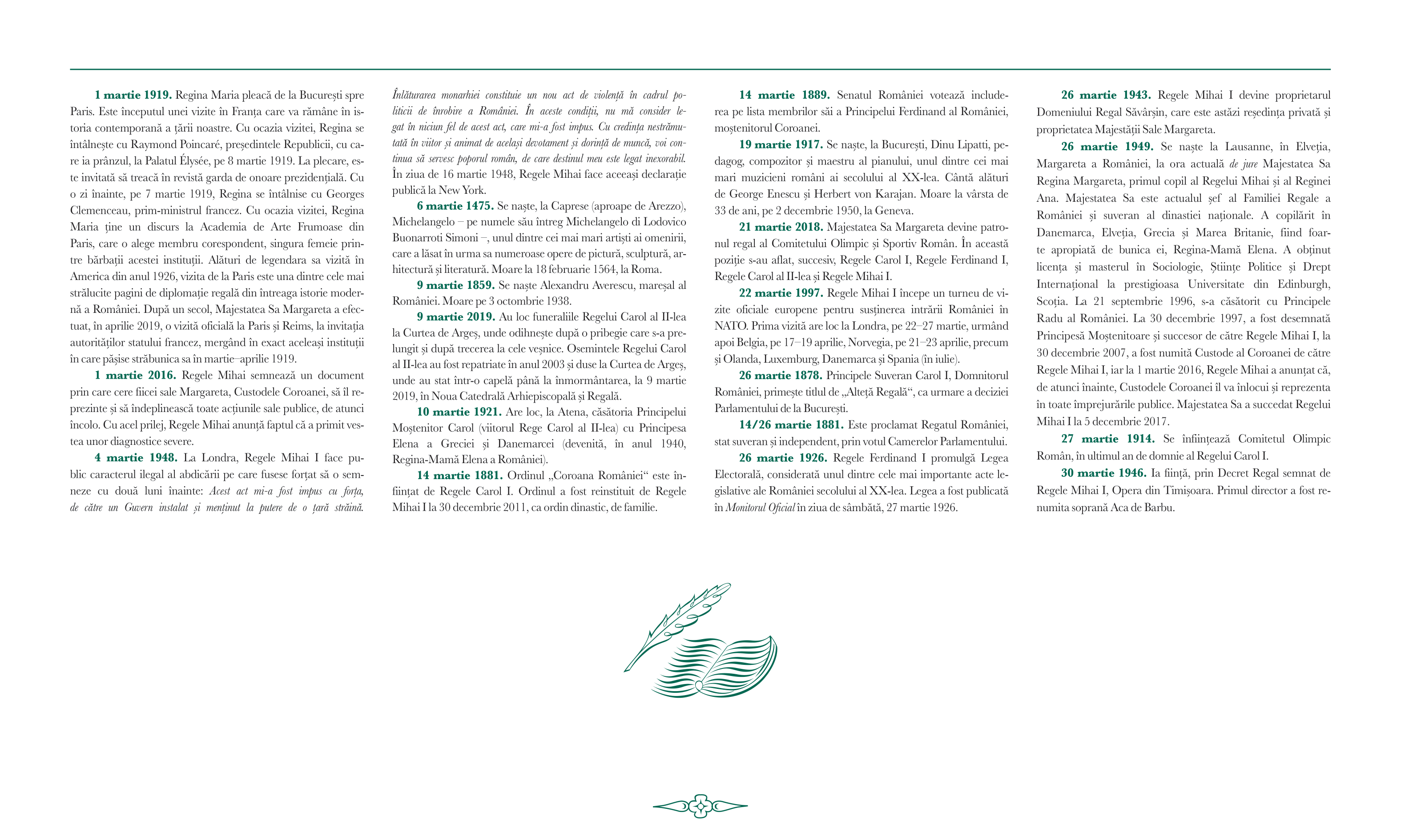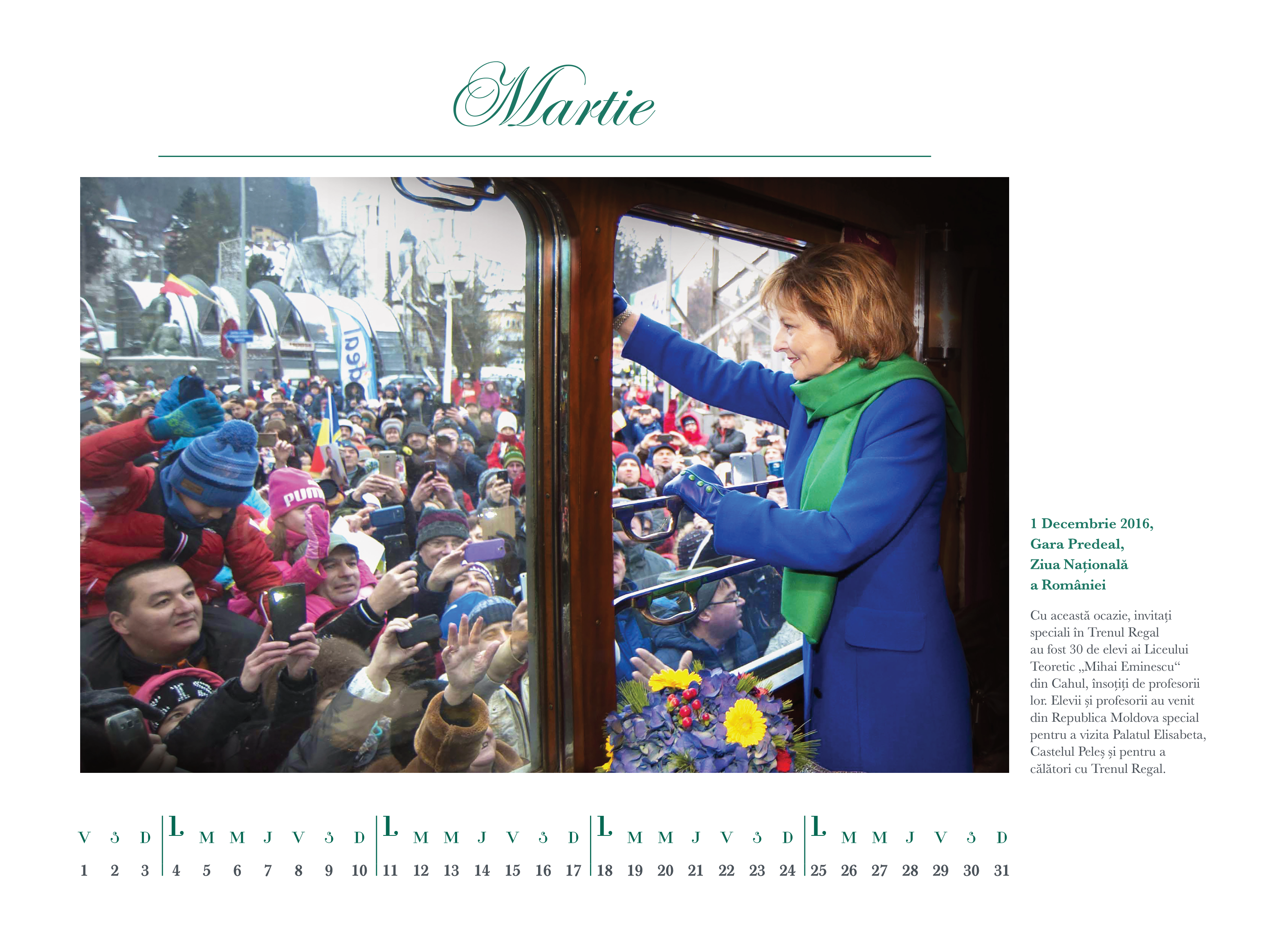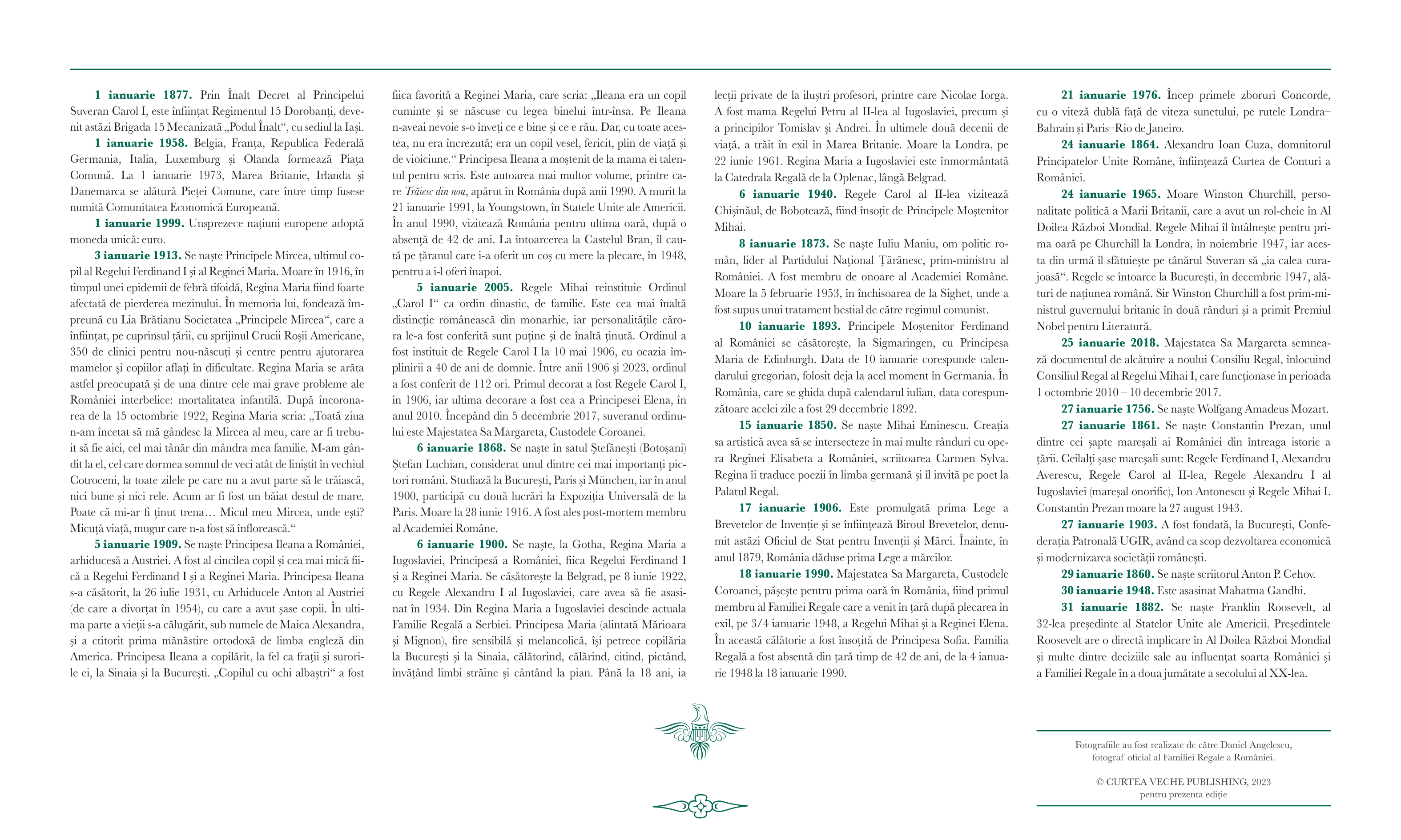 Ediția Calendarului regal din 2024 continuă tradiția tematică a anilor anteriori și le propune atât pasionaților de istorie, cât și publicului general o suită de imagini ale Trenului Regal, cel cu care, începând din anul 2012, Familia Regală călătorește anual, refăcând traseele-reper pentru evenimentele care au marcat istoria modernă a României. Atât vederile din Vagonul Sufragerie, cât și cele din diferitele gări în care românii îi întâmpină pe Majestatea Sa Margareta, pe Alteța Sa Regală Principele Radu și pe Alteța Sa Regală Principesa Sofia stau drept mărturie pentru memoria vie a regalității în conștiința poporului român și pentru relația caldă pe care aceasta o întreține cu el, vădindu-i relevanța într-un prezent tot mai văduvit de eleganța unor repere istorice, identitare și morale.