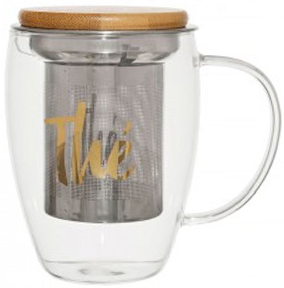 Cană pentru infuzarea ceaiului, cu sită din oțel inoxidabil și capac din lemn, practică și ușor de folosit.