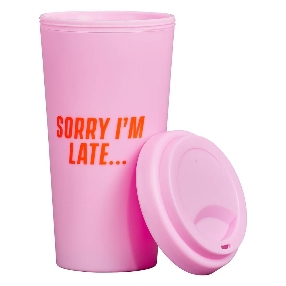 Cana de voiaj cu mesajul "Sorry I'm late - I just really don't want to be here".