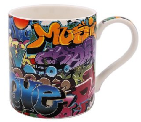 Această cană are ilustrat modelul multicolor care amintește de desenele pe ziduri. Capacitatea de 380 ml a cănii este perfectă.