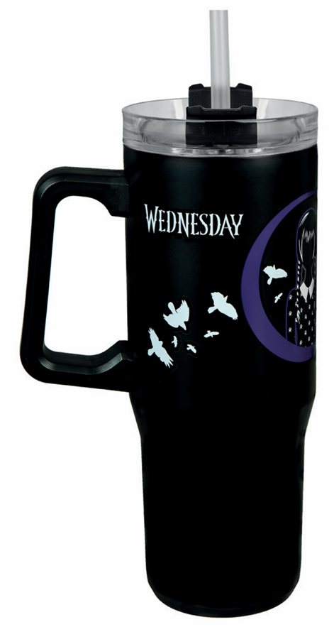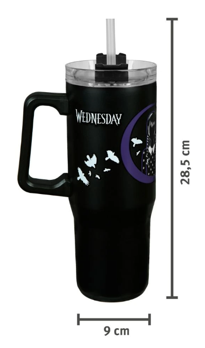 Cana termos de 880 ml cu tematică de miercuri vă va menține băuturile calde sau reci pentru o perioadă lungă de timp datorită izolației în vid. Companionul ideal pentru călătorii, școală și utilizare zilnică.