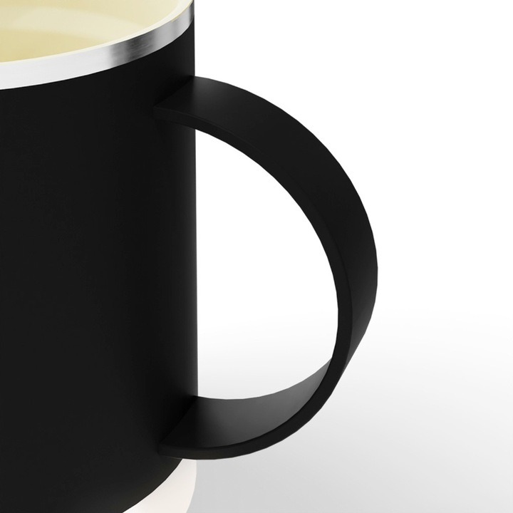 Cană termică cu pereți dubli pentru a nu simți căldura sau răceala băuturii și cu căptușeală interioară din ceramică.