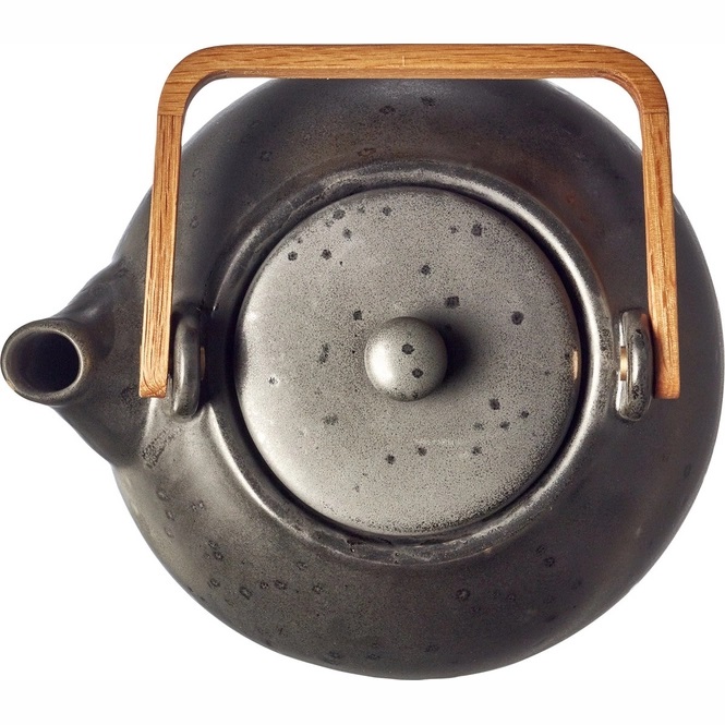 Ceainic încăpător din ceramică cu o textură specială și mâner de lemn.