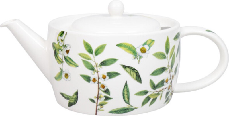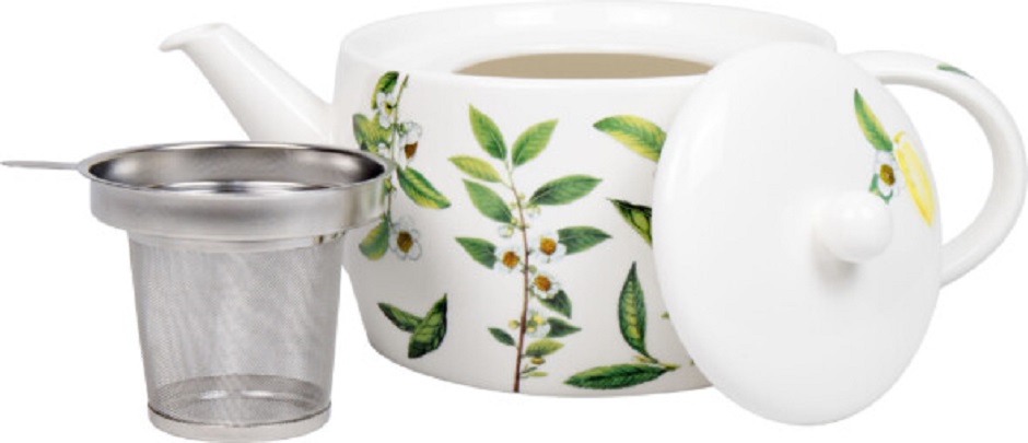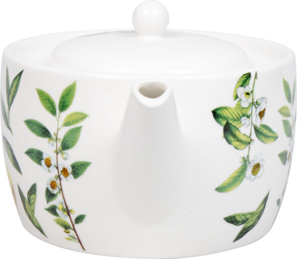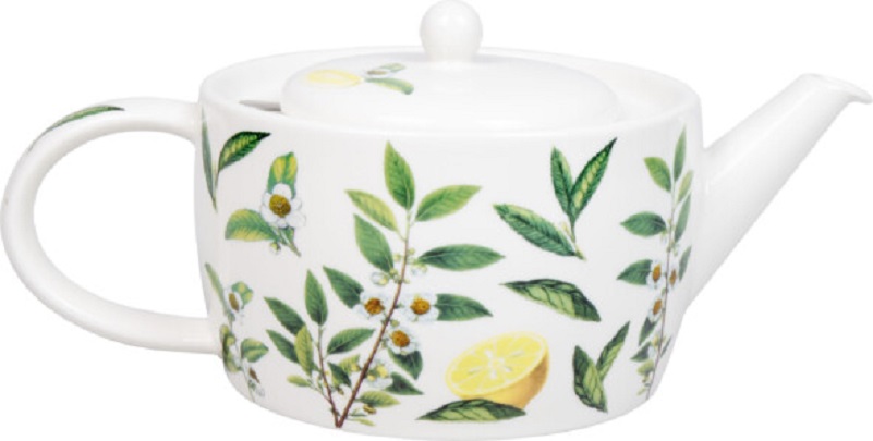 Acest ceainic elegant are un colaj de frunze de ceai și lămâi. Elementele individuale sunt distribuite uniform pe întregul ceainic.