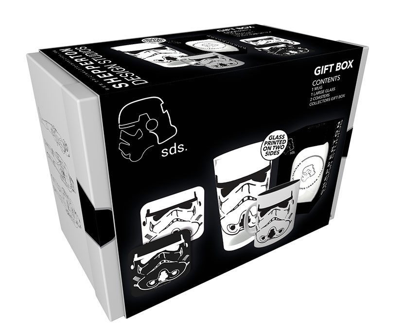 În interiorul cutiei găsiți două suporturi pentru pahare, o cană și un pahar, toate cu tematică "Star Wars".