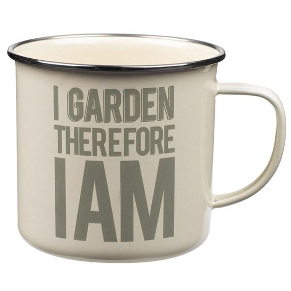 Take a break from the pruning and enjoy a nice cup of tea. I Garden Therefore I Am enamel coated tin mug in cream with stainless steel rim.