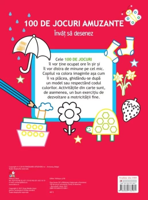 Cele 100 DE JOCURI îl vor ține ocupat ore în șir și îl vor distra de minune pe cel mic. Copilul va colora imaginile așa cum îi va plăcea, ghidându-se după un model sau respectând codul culorilor. Activitățile din carte sunt, de asemenea, un bun exercițiu de dezvoltare a motricității fine.