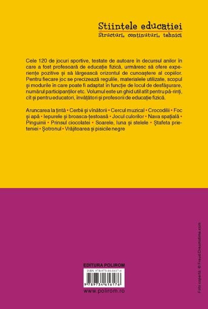 Cele 120 de jocuri sportive, testate de autoare in decursul anilor in care a fost profesoara de educatie fizica, urmaresc sa ofere experiente pozitive si sa largeasca orizontul de cunoastere al copiilor. Pentru fiecare joc se precizeaza regulile, materialele utilizate, scopul si modurile in care poate fi adaptat in functie de locul de desfasurare, numarul participantilor etc. Volumul este un ghid util atit pentru parinti, cit si pentru educatori, invatatori si profesorii de educatie fizica.