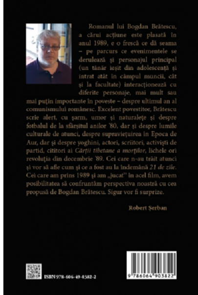 Romanul lui Bogdan Brătescu, a cărui acțiune este plasată în anul 1989, e o frescă ce dă seama – pe parcurs ce evenimentele se derulează și personajul principal (un tânar ieșit din adolescență și intrat atât în câmpul muncii, cât și la facultate) interacționează cu diferite personaje, mai mult sau mai puțin importante în poveste – despre ultimul an al comunismului românesc. Excelent povestitor, Brătescu scrie alert, cu șarm, umor și naturalețe și despre fotbalul de la sfârșitul anilor '80, dar și despre lumile culturale de atunci, despre supraviețuirea în Epoca de Aur, dar și despre yoghini, actori, scriitori, activiști de partid, cititori ai Cărții tibetane a morților, lichele ori revoluția din decembrie '89. Cei care n-au trăit atunci și vor să afle cum și ce a fost au la îndemână 21 de zile. Cei care am prins 1989 și am „jucatˮ în acel film avem posibilitatea să confruntăm perspectiva noastră cu cea propusă de Bogdan Brătescu. Sigur vor fi surprize. (Robert Șerban)