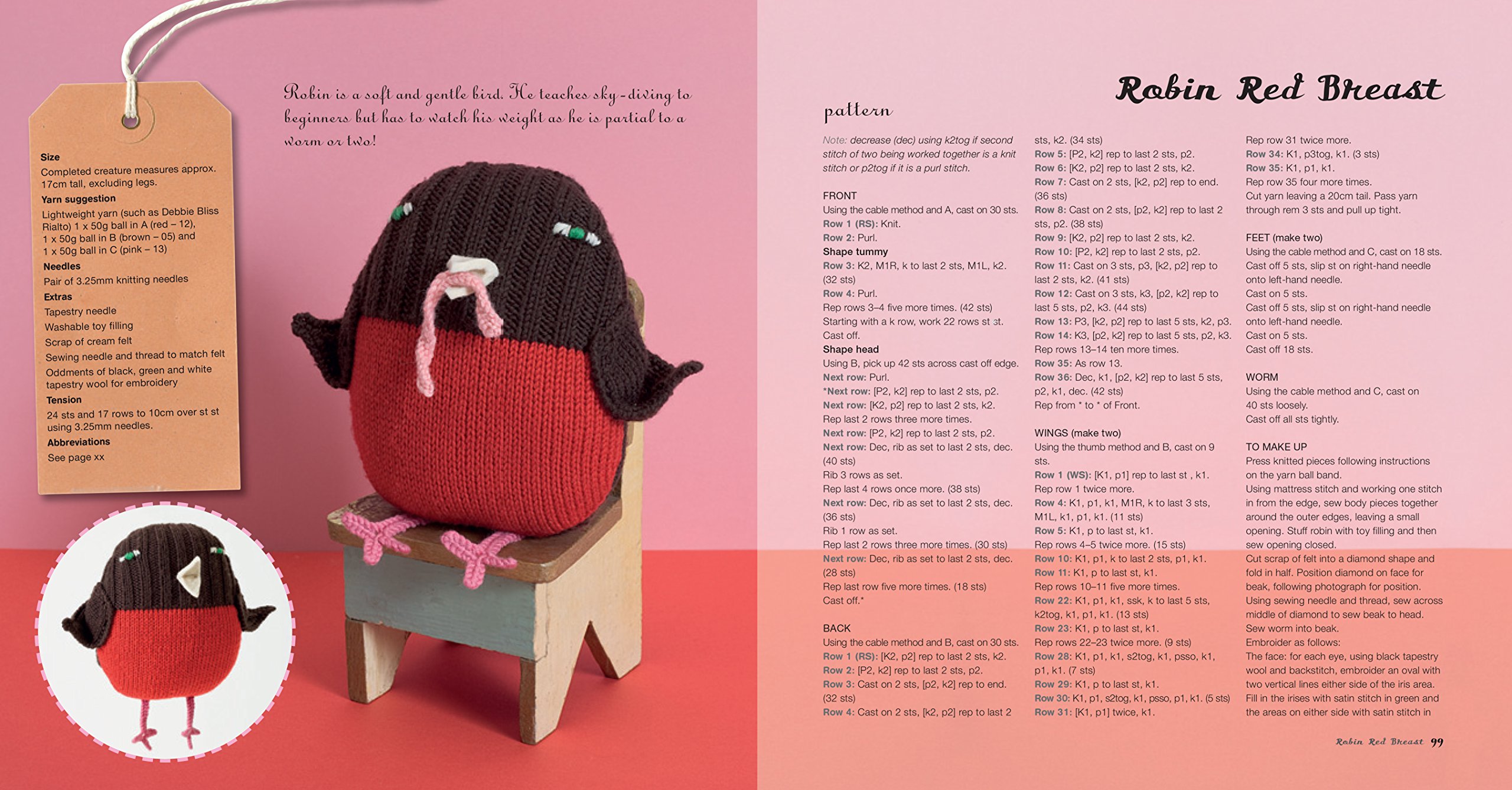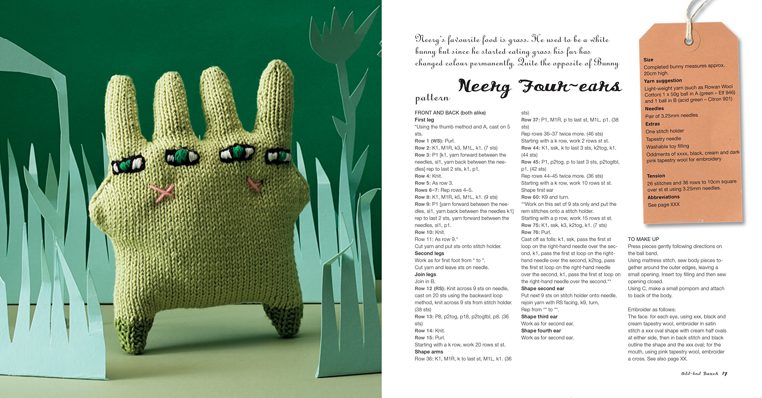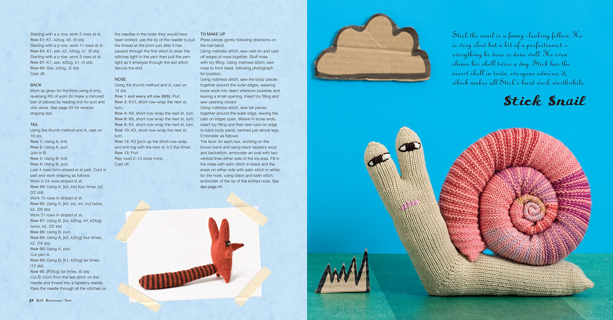 There’s Rill Raccoon-Fox, who is fond of toasting caterpillars and worms over the camp fire, son of the great raconteur Cyril Squirrel and the delightful Rita Raccoon. Meet Beryl the Bold, a lover of chocolate-chip ice cream and evening walks, and Bunny Blue, who enjoys nothing more than a picnic and a glass of raspberry juice. Olive Owl is small with a loud voice; she likes to have a tidy home and makes a mean apple pie. Charlie Monkey, who lives on banana milkshakes, always stands out in a crowd, while Ginge the Cat and Mitten Kitten form a formidable feline duo. Use the easy-to-follow knitting patterns to recreate your own collection of knitted animals and other creatures, each with their own unique personality and idiosyncrasies.