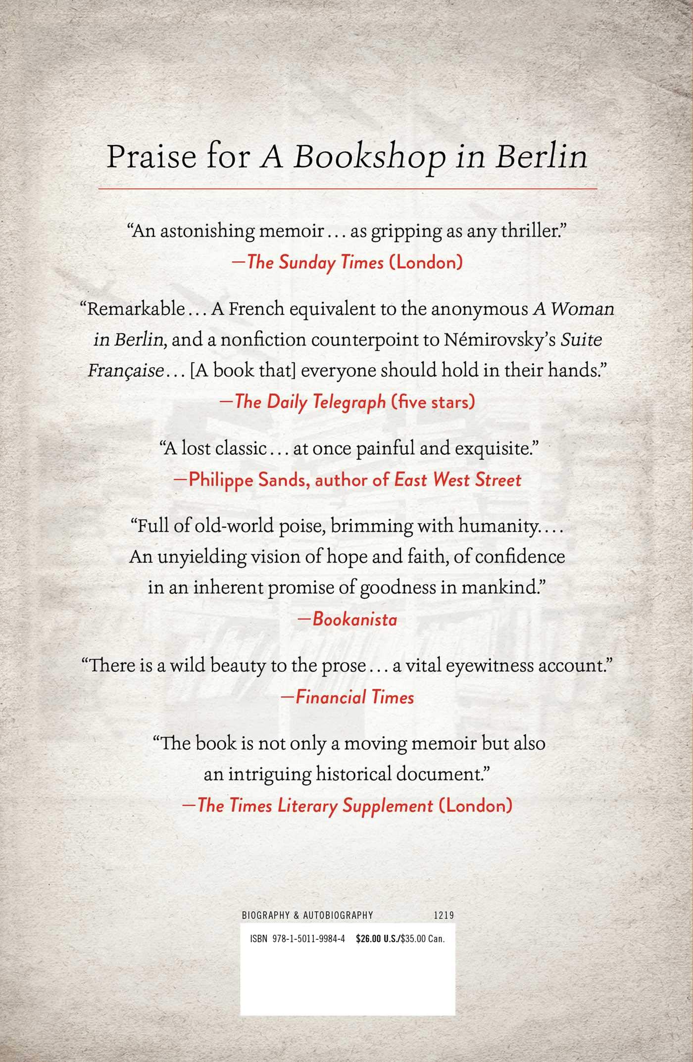 In 1921, Françoise Frenkel--a Jewish woman from Poland--fulfills a dream. She opens La Maison du Livre, Berlin's first French bookshop, attracting artists and diplomats, celebrities and poets. The shop becomes a haven for intellectual exchange as Nazi ideology begins to poison the culturally rich city. In 1935, the scene continues to darken. First come the new bureaucratic hurdles, followed by frequent police visits and book confiscations.