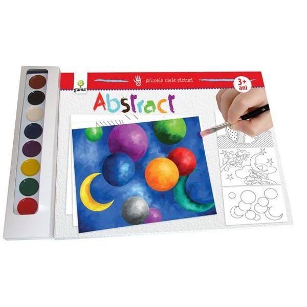 Caietul conține 20 de planșe cu desene abstracte și este însoțit de o cutie de acuarele și o pensulă.