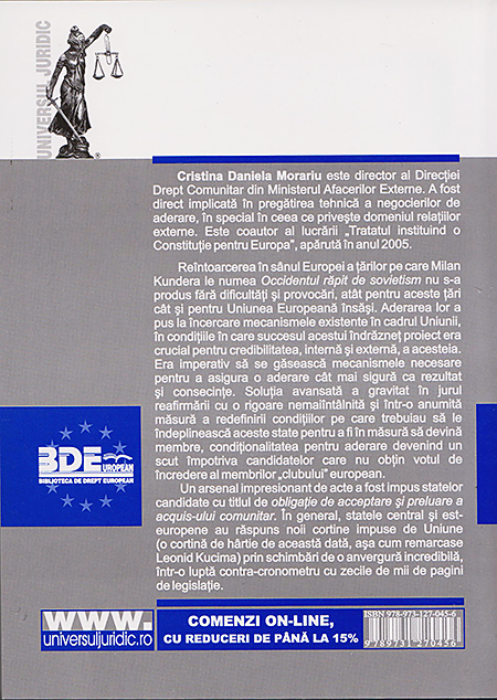 Cristina Daniela Morariu este director al Directiei Drept Comunitar din Ministerul Afacerilor Externe. A fost direct implicata in pregatirea tehnica a negocierilor de aderare, in special in ceea ce priveste domeniul relatiilor externe. Este coautor al lucrarii "Tratatul instituind o Constitutie pentru Europa", aparuta in anul 2005. Reintoarcerea in sanul Europei a tarilor pe care Milan Kundera le numea Occidentul rapit de sovietism nu s-a produs fara dificultati si provocari, atat pentru aceste tari cat si pentru Uniunea Europeana insasi. Aderarea lor a pus la incercare mecanismele existente in cadrul Uniunii, in conditiile in care succesul acestui indraznet proiect era crucial pentru credibilitatea, interna si externa, a acesteia. Era imperativ sa se gaseasca mecanismele necesare pentru a asigura o aderare cat mai sigura ca rezultat si consecinte. Solutia avansata a gravitat in jurul reafirmarii cu o rigoare nemaiintalnita si intr-o anumita masura a redefinirii conditiilor pe care trebuiau sa le indeplineasca aceste state pentru a fi in masura sa devina membre, conditionalitatea pentru aderare devenind un scut impotriva candidatelor care nu obtin votul de incredere al membrilor "clubului" european. Un arsenal impresionant de acte a fost impus statelor candidate cu titlul de obligatie de acceptare si preluare a acquis-ului comunitar. In general, statele central si est-europene au raspuns noii cortine impuse de Uniune (o cortina de hartie de aceasta data, asa cum remarcase Leonid Kucima) prin schimbari de o anvergura incredibila, intr-o lupta contra-cronometru cu zecile de mii de pagini de legislatie.