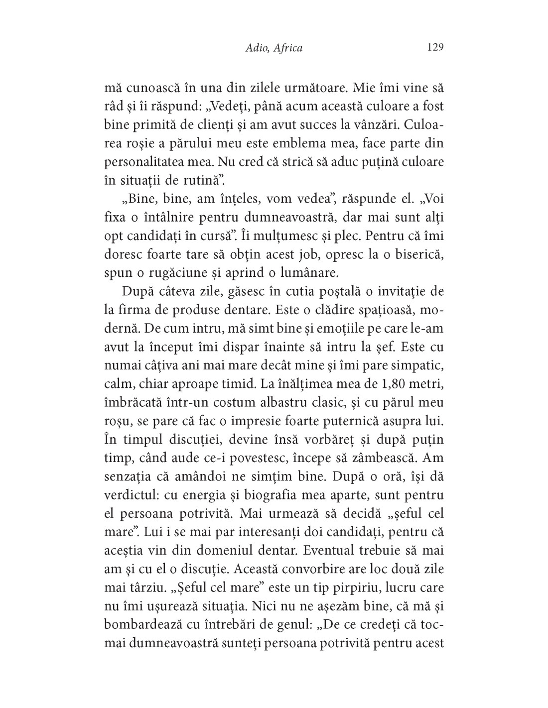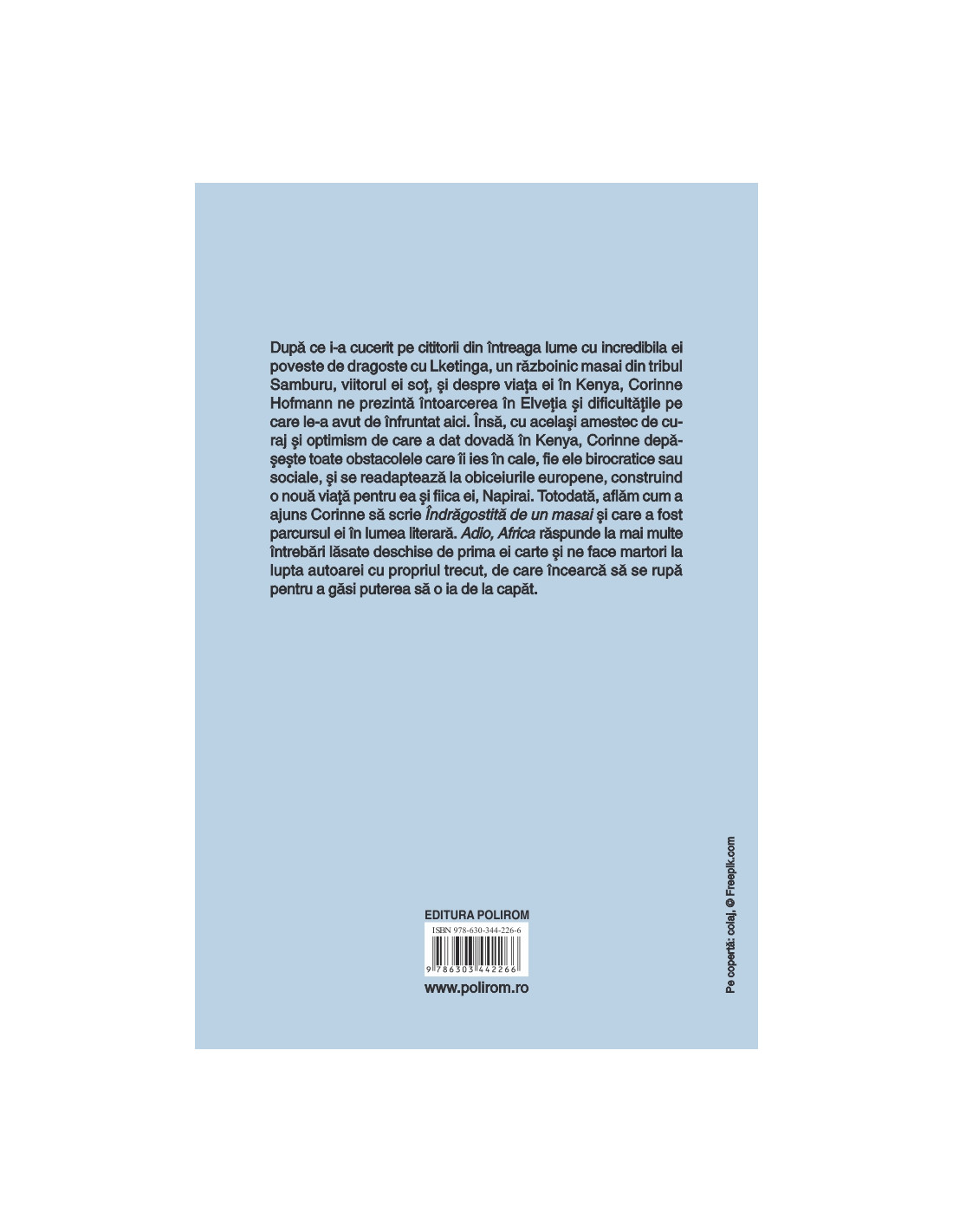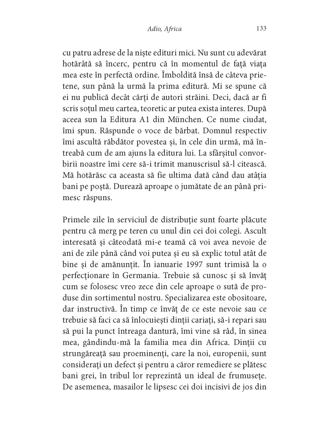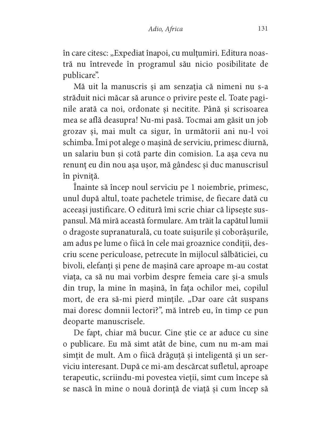 Adio, Africa răspunde la mai multe întrebări lăsate deschise de prima ei carte și ne face martori la lupta autoarei cu propriul trecut, de care încearcă să se rupă pentru a găsi puterea să o ia de la capăt.