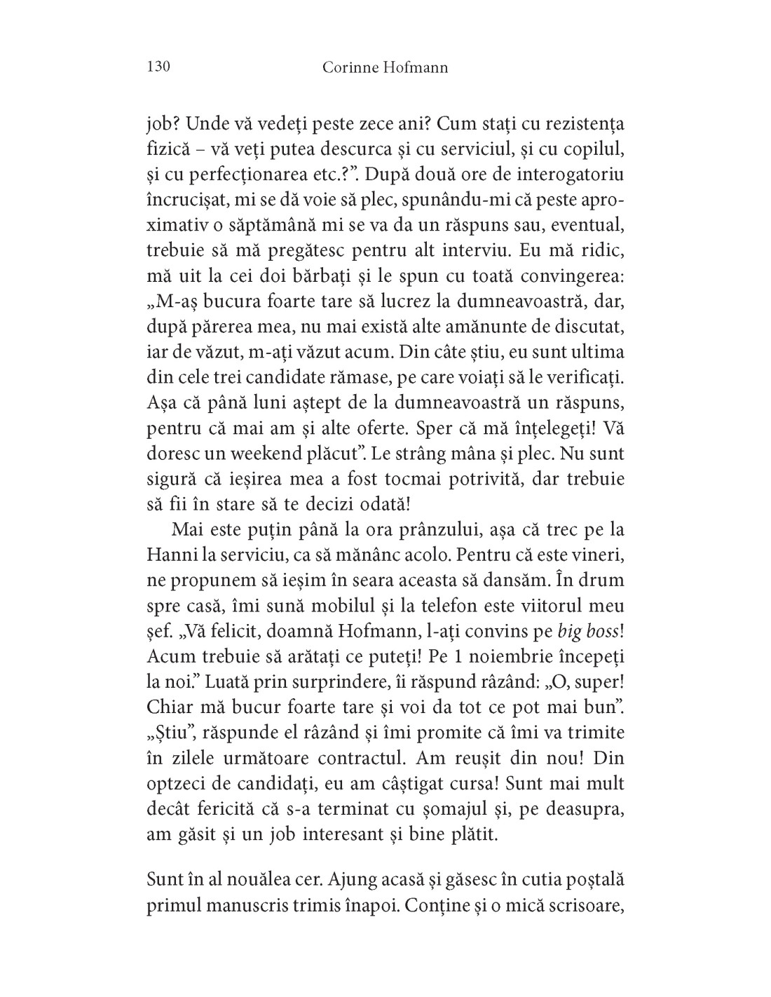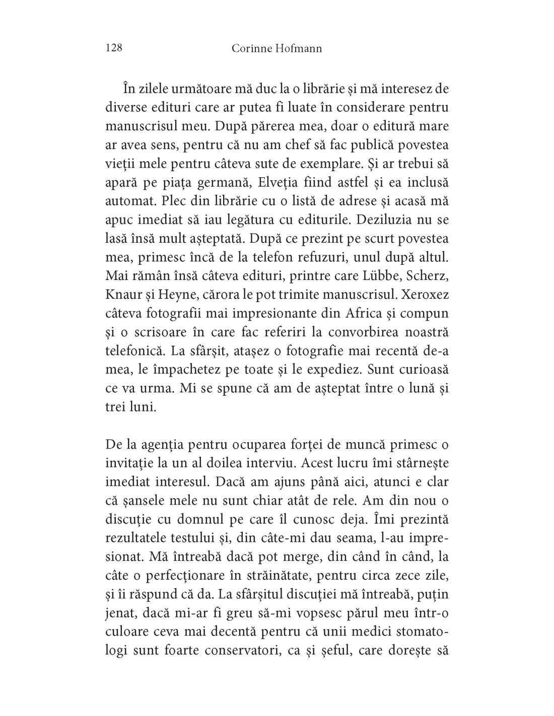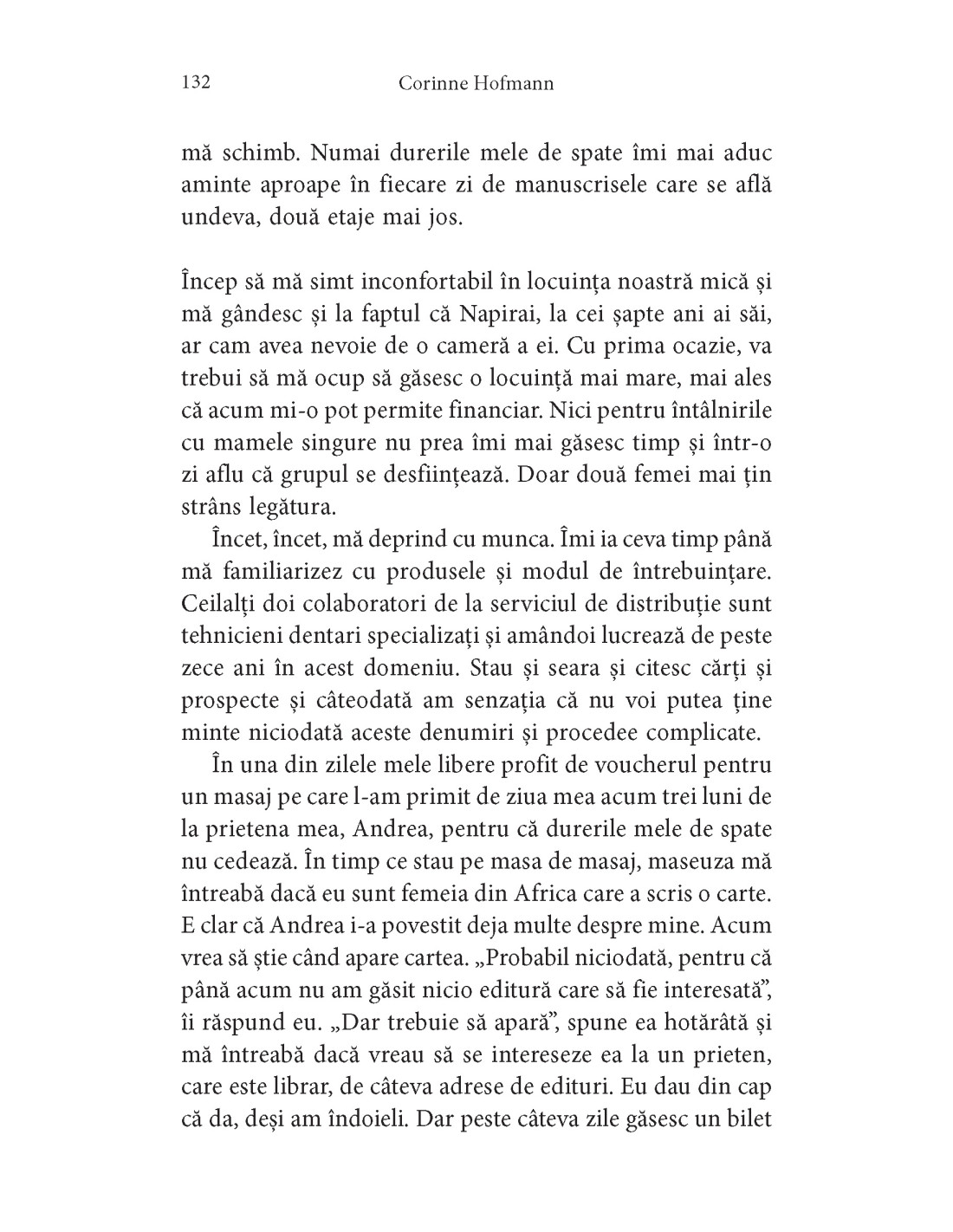 După ce i-a cucerit pe cititorii din întreaga lume cu incredibila ei poveste de dragoste cu Lketinga, un războinic masai din tribul Samburu, viitorul ei soț, și despre viața ei în Kenya, Corinne Hofmann ne prezintă întoarcerea în Elveția și dificultățile pe care le-a avut de înfruntat aici.
