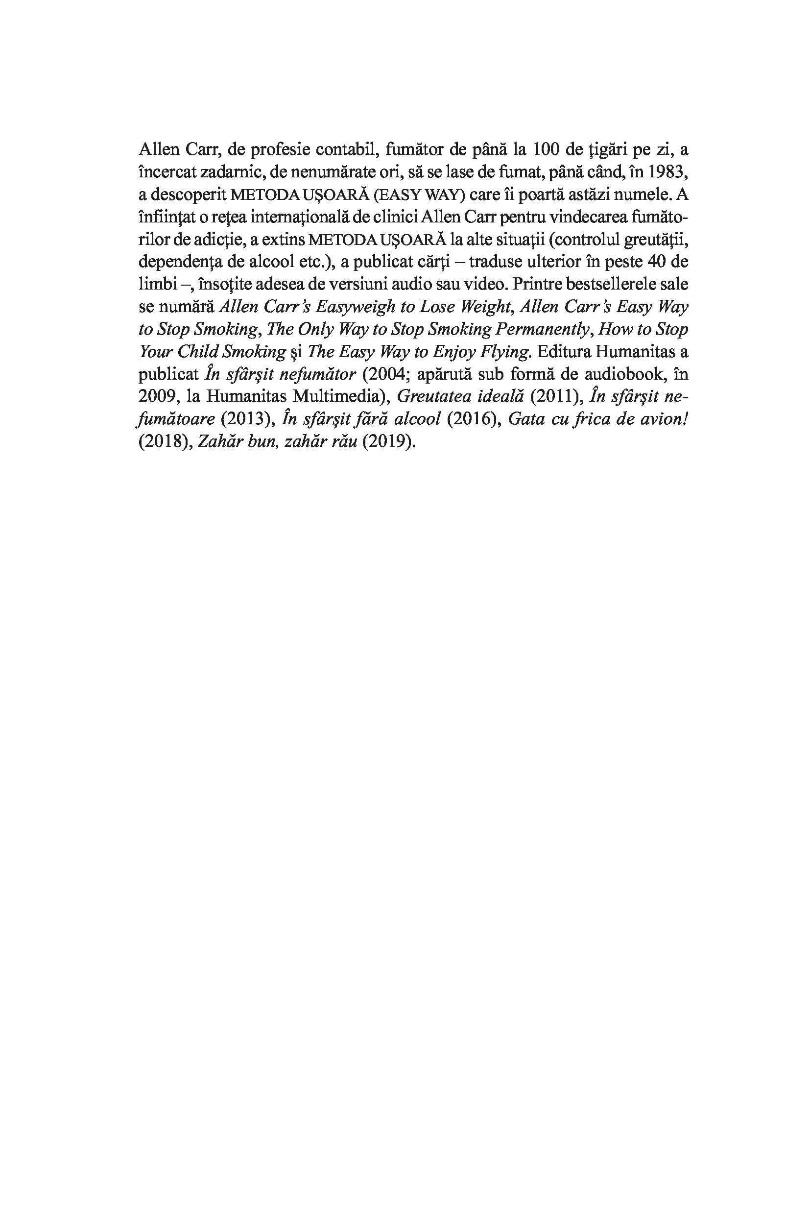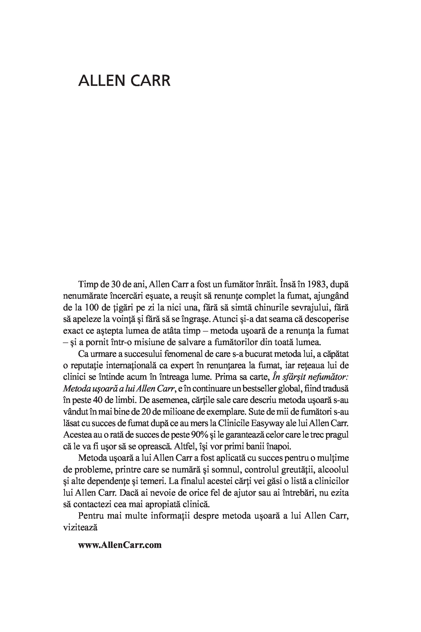 Metoda ușoară a lui Allen Carr, recunoscută în toată lumea, a ajutat peste 50 de milioane de oameni să-și vindece problemele de comportament și dependența de nicotină, alcool, droguri, mâncare, dispozitive digitale, rețele sociale.