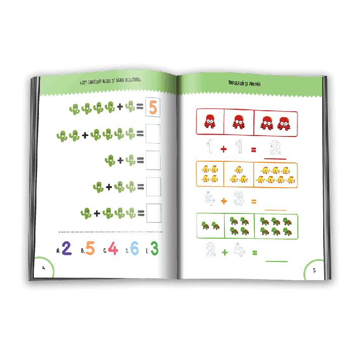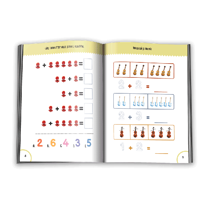 Adunări vizuale conține activități cu adunări simple, pe care copilul va putea să le rezolve cu ajutorul numărării. Va avea de ales rezultatele corecte, va învăța să transforme informații vizuale în operații simple de adunare și va învăța cum se face descompunerea unor mulțimi de obiecte. Cerințele scrise cu majuscule îi vor oferi posibilitatea să rezolve singur activitățile și să-și dezvolte autonomia.