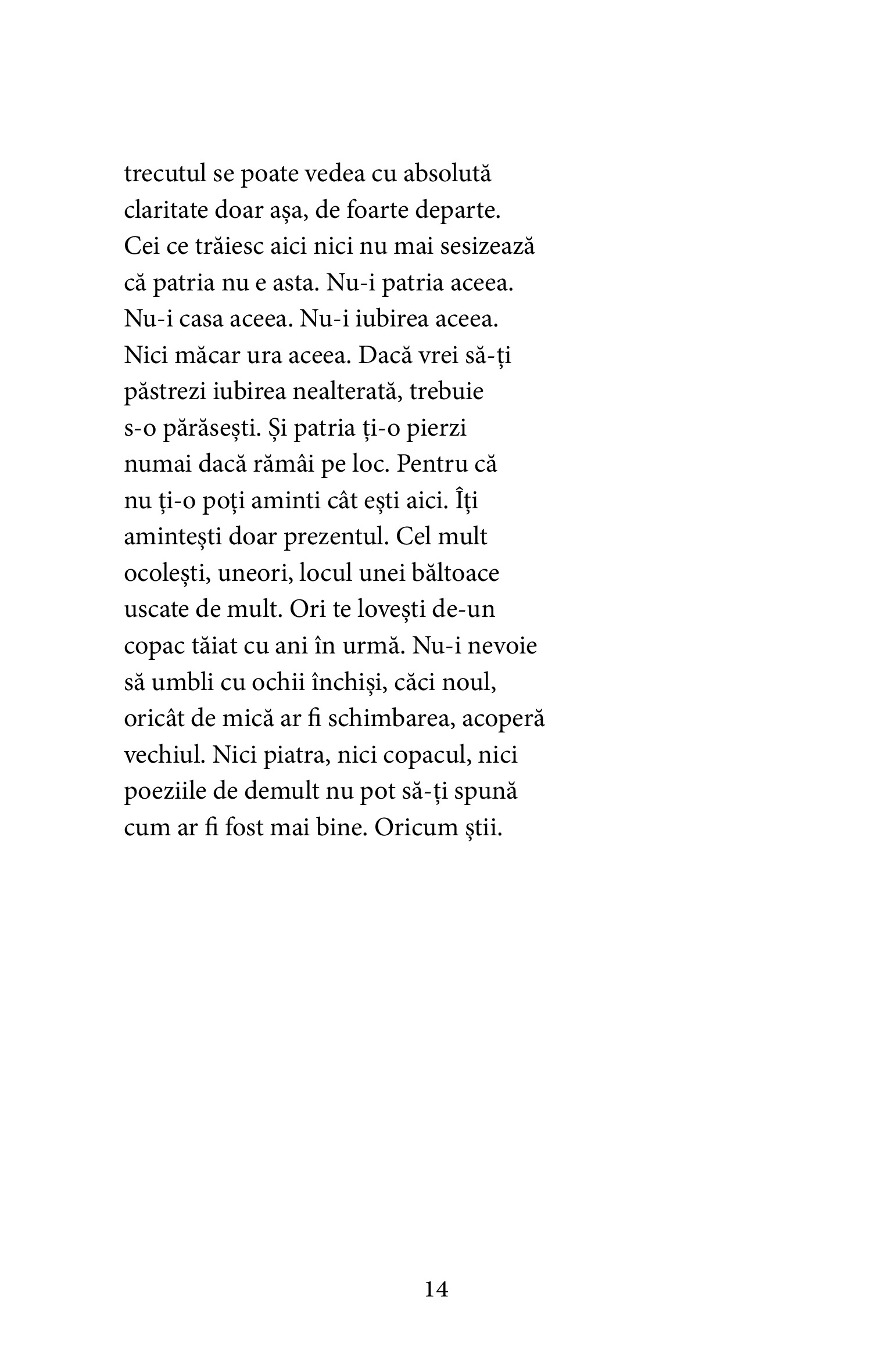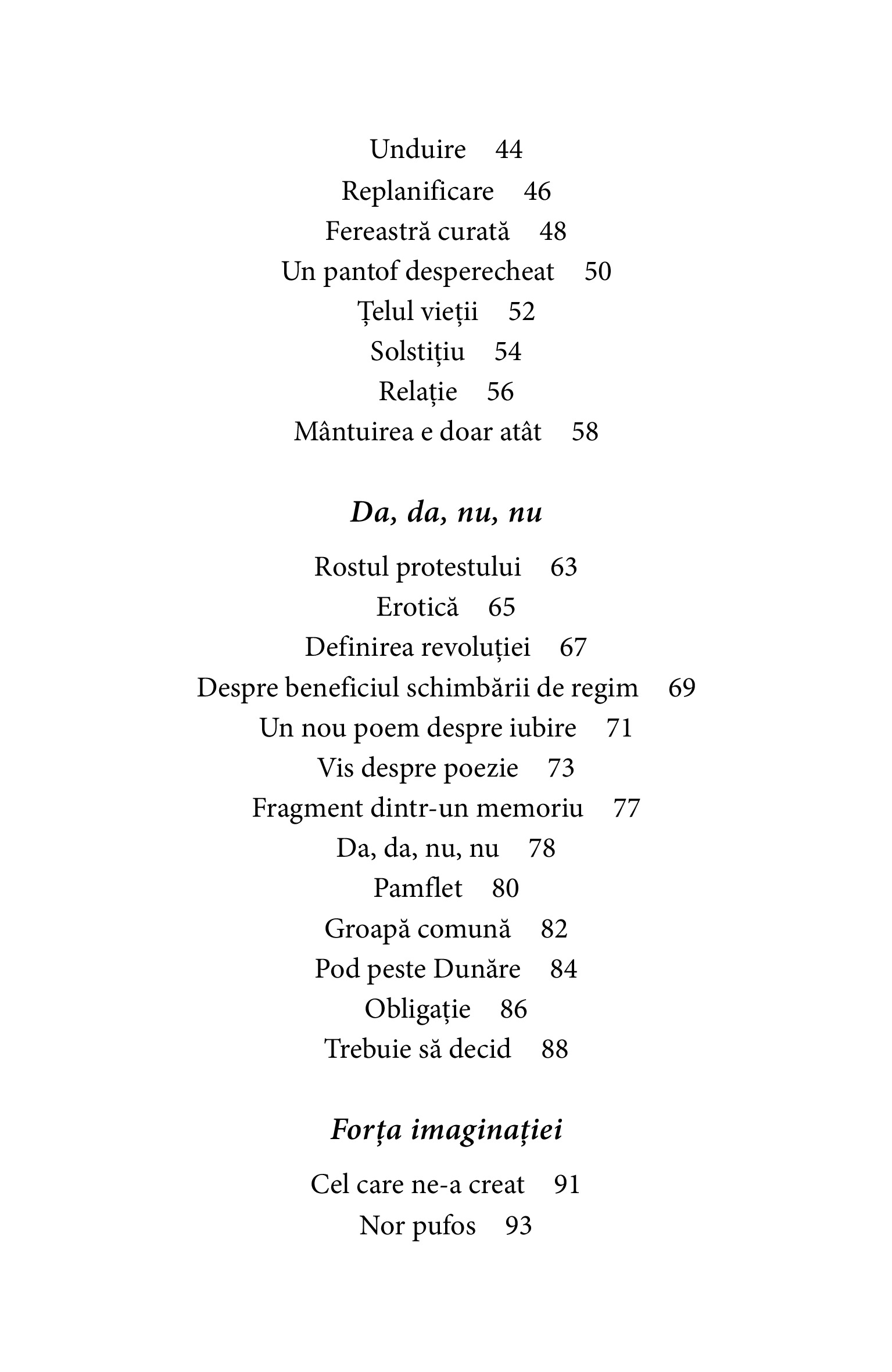 Nimic din partiturile de emfază ale poeziei, fie ele procedurale, imaginative sau reflexive, nu mai umbrește transparența deplină a unei poezii a concretului palpabil și cotidian. Deși sigură pe ea, poezia nu mai profesează nicio aroganță, trăind din seninătatea melancolică și nostalgică a unui înțelept care vede viața estompându-se și absența ocupând toate locurile.